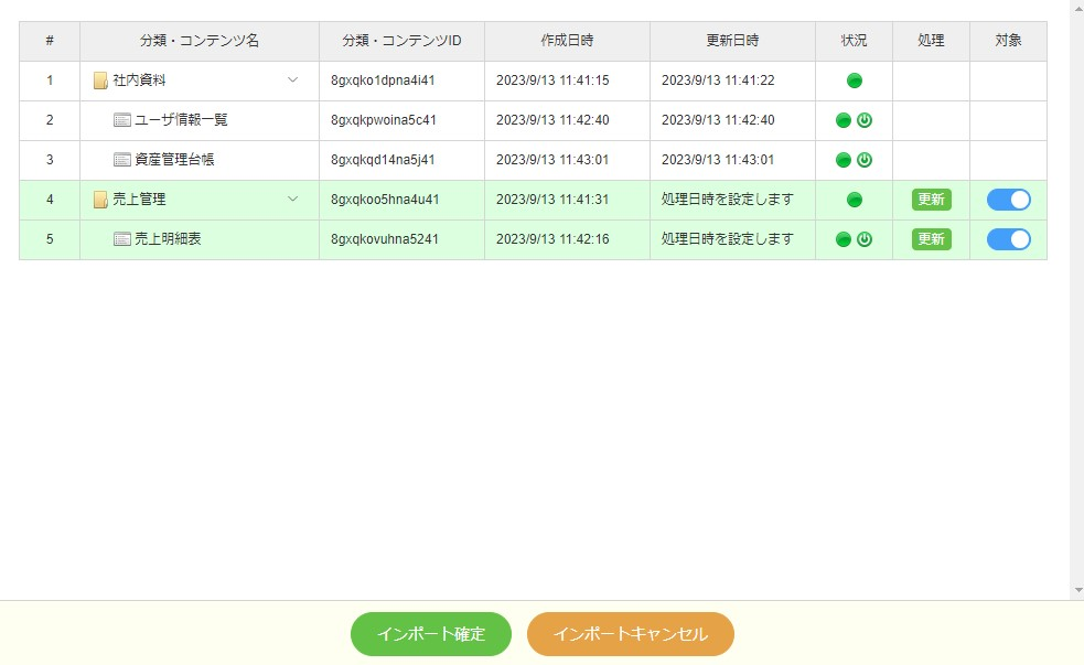 更新する対象に問題がない場合、インポート確定ボタンを押して反映します。
