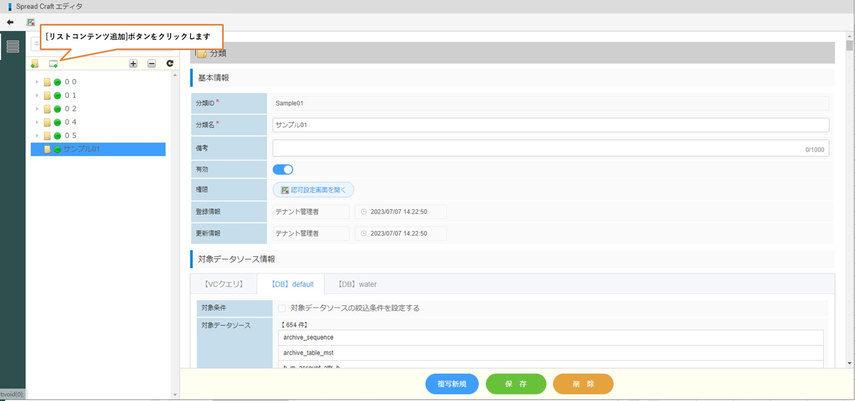 ① 「分類追加」ボタンをクリックしてコンテンツのための分類を追加します。