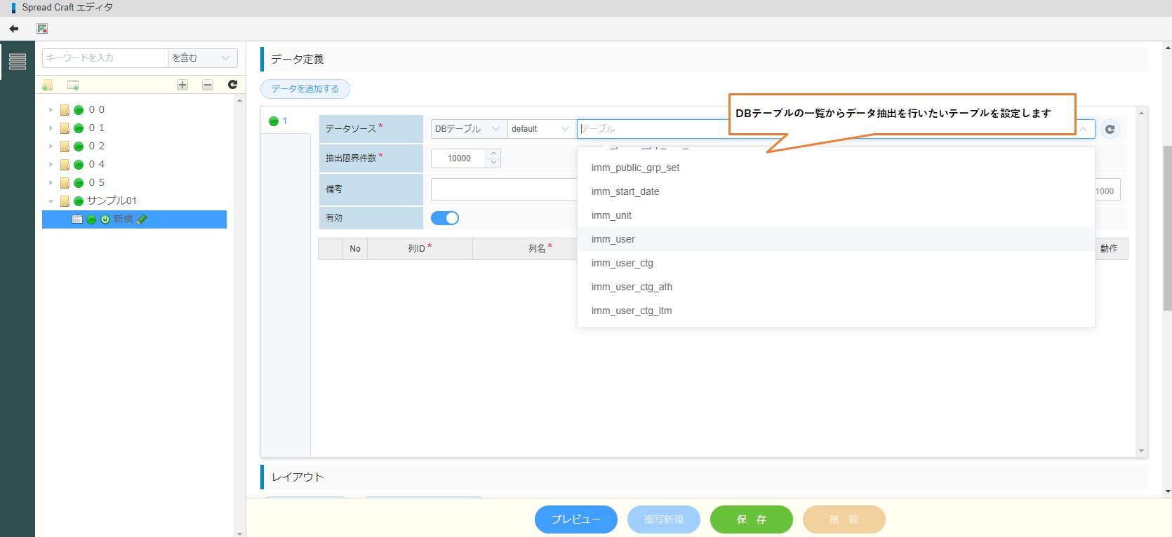 ①SpreadCraftEditorにてコンテンツ作成時にデータソースとしてDBビューを設定します。
