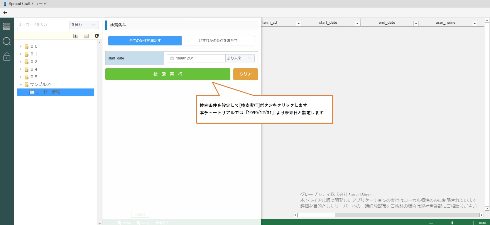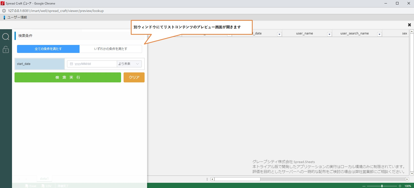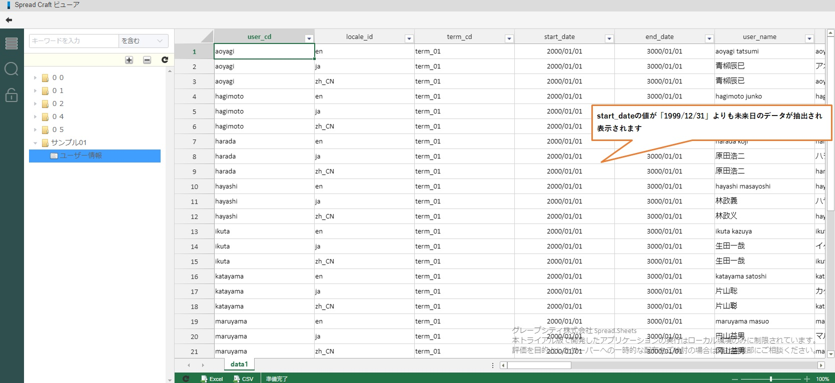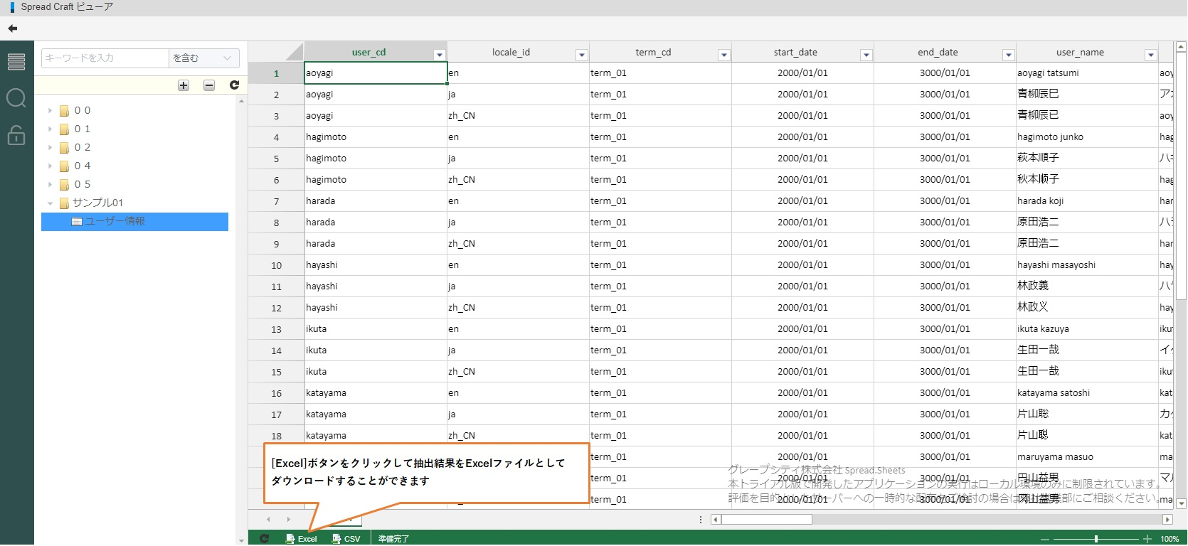 検索条件によって絞り込まれたデータソースの内容がExcelライクに表示されます。