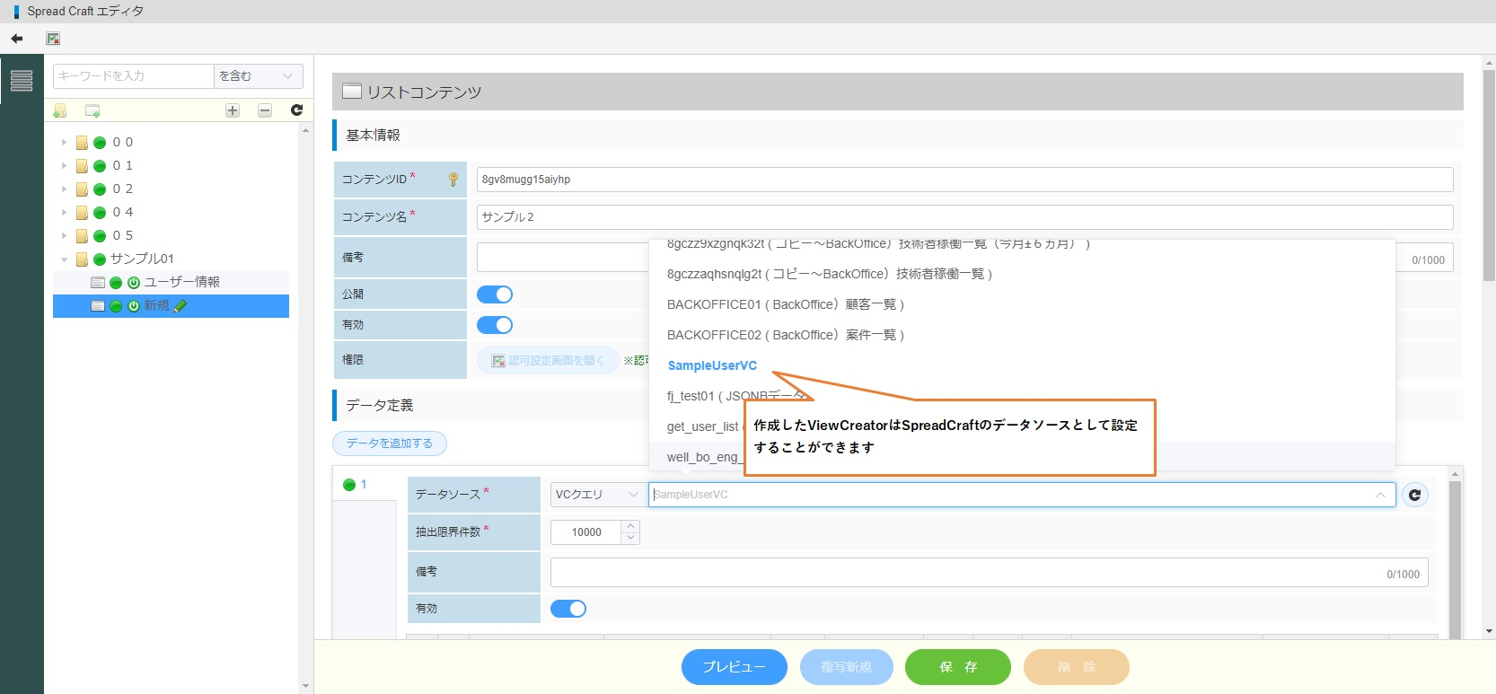 ④SpreadCraftEditorにてコンテンツ作成時にデータソースとして作成したViewCreatorを設定します。