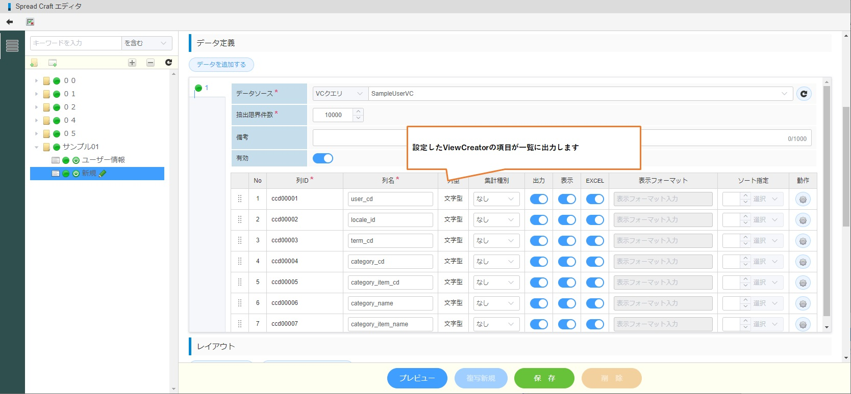 ViewCreatorの出力項目がデータソースの項目設定に反映されます。