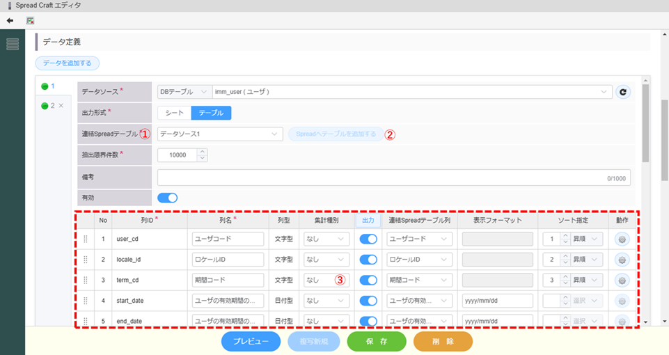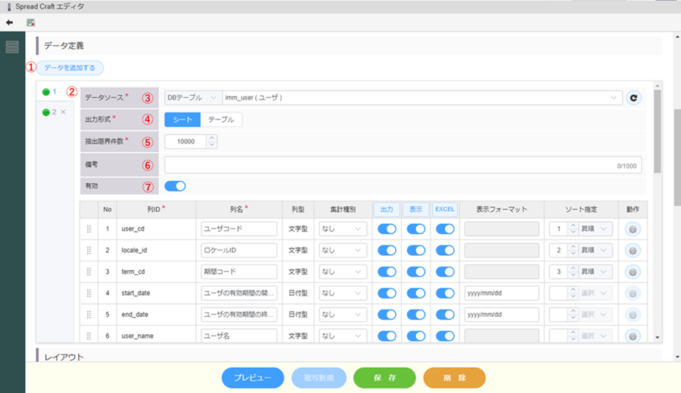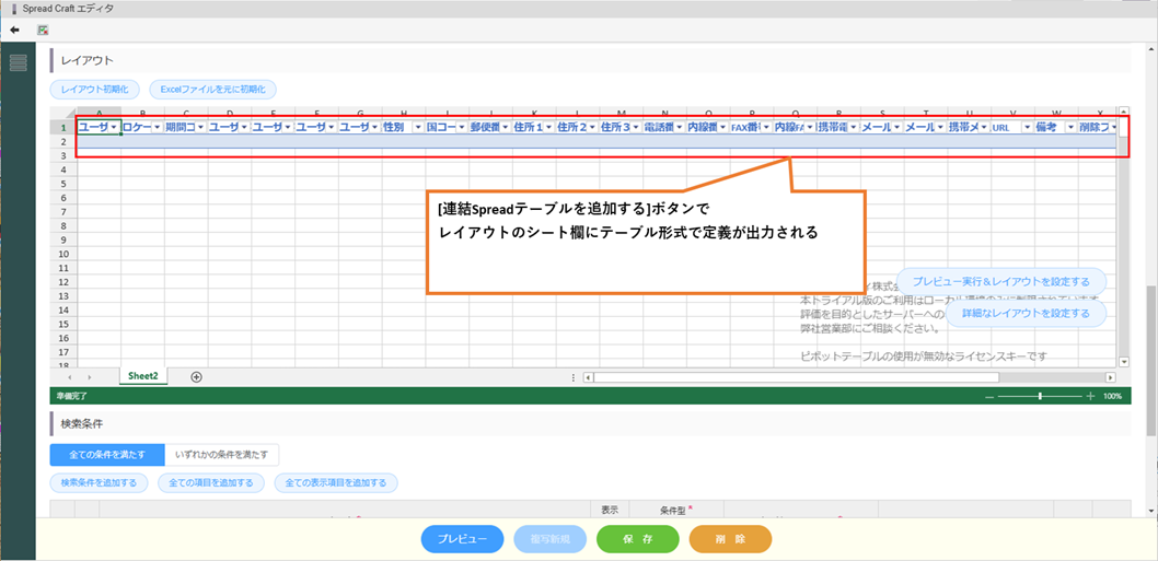 検索条件の設定、スプレッドに抽出するデータ定義およびスプレッドのレイアウト設定を行うことができます。