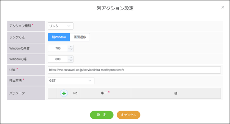 実行時動作の設定により、デフォルト検索、データ編集、Excel形式またはCSV形式でのエクスポートが可能です。