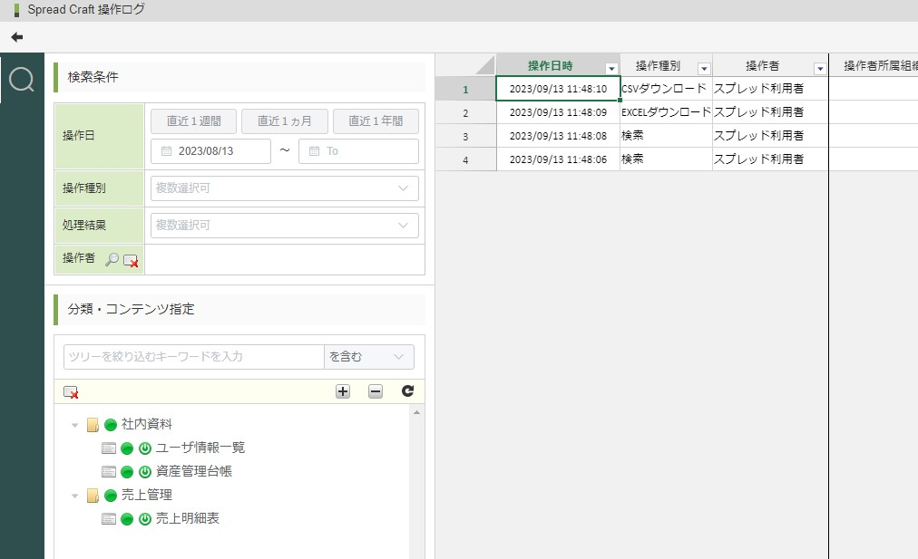 SpreadCraftではSpreadCraft上で行われたデータ検索、ダウンロードに対して操作ログの記録を行います。
