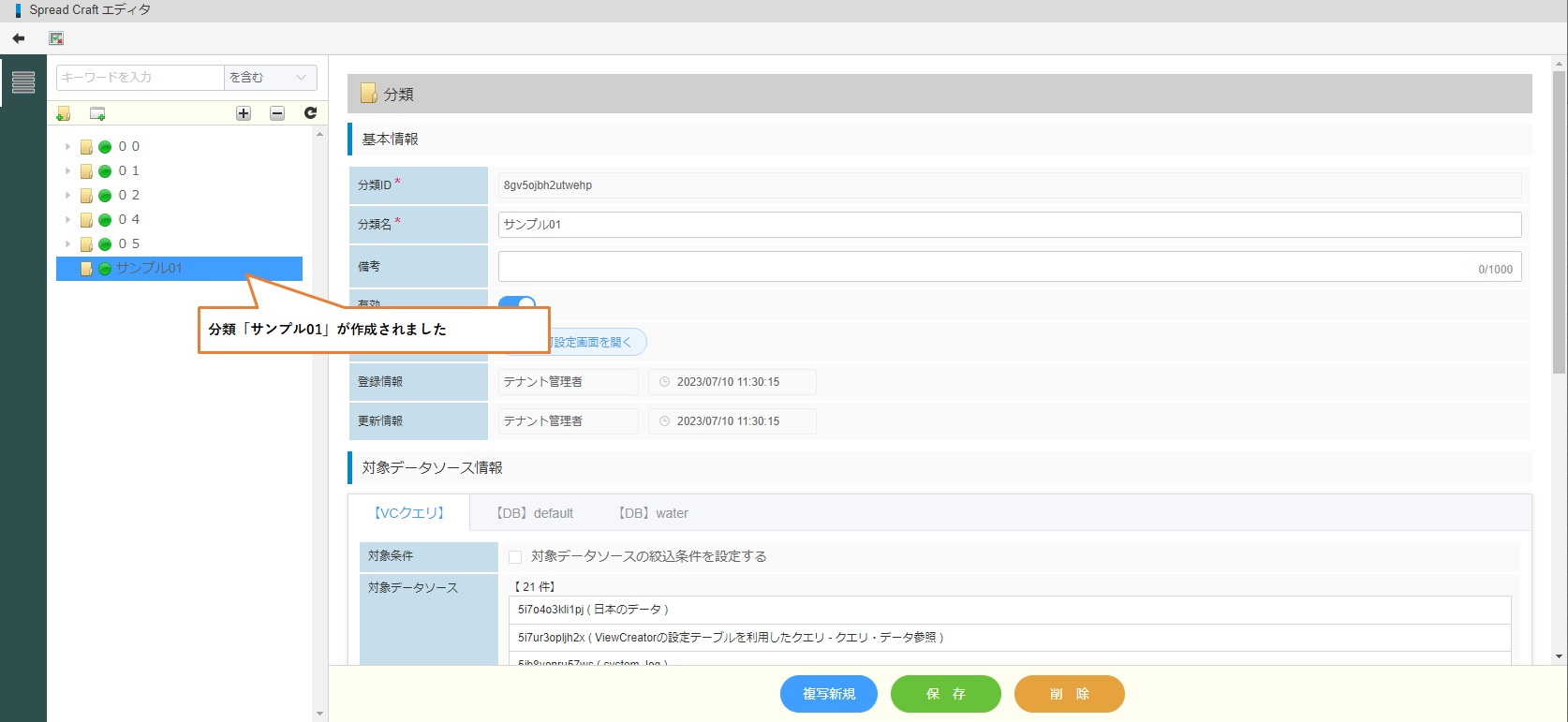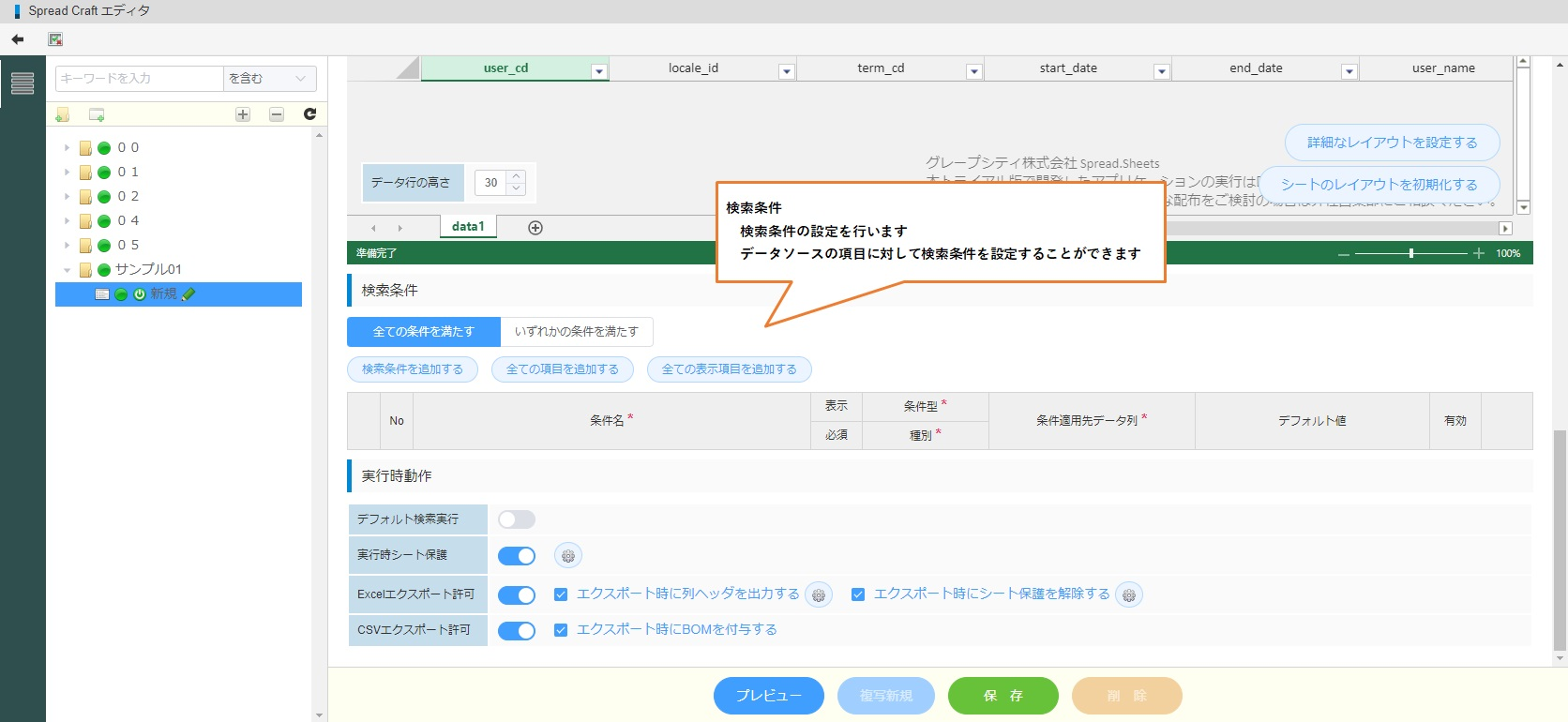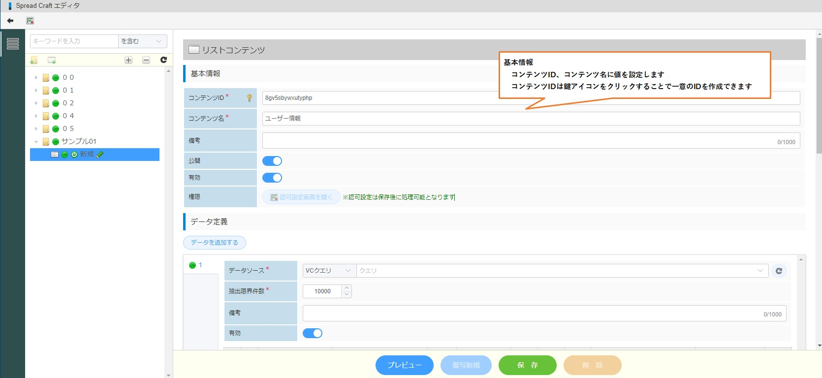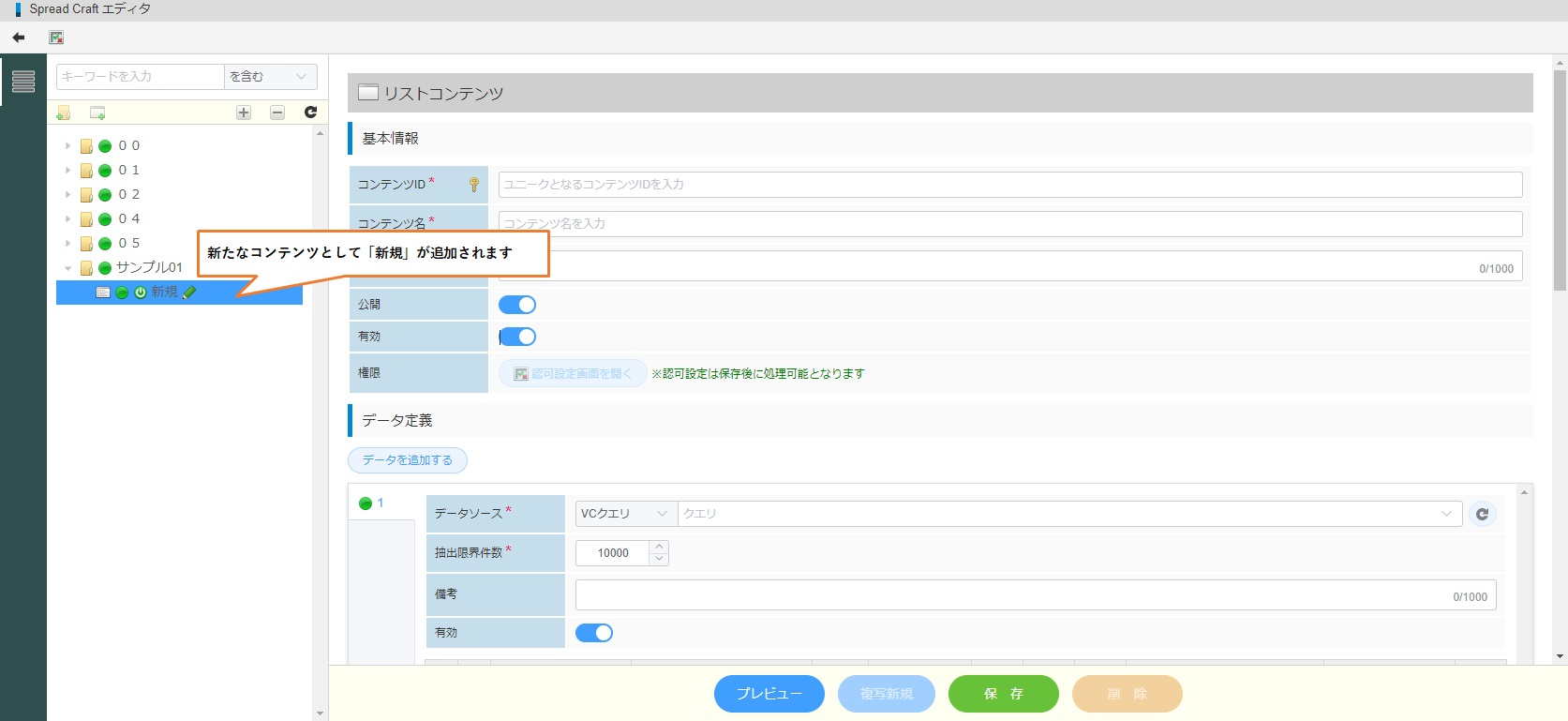 ④SpreadCraftEditorにてコンテンツ作成時にデータソースとして作成したViewCreatorを設定します。