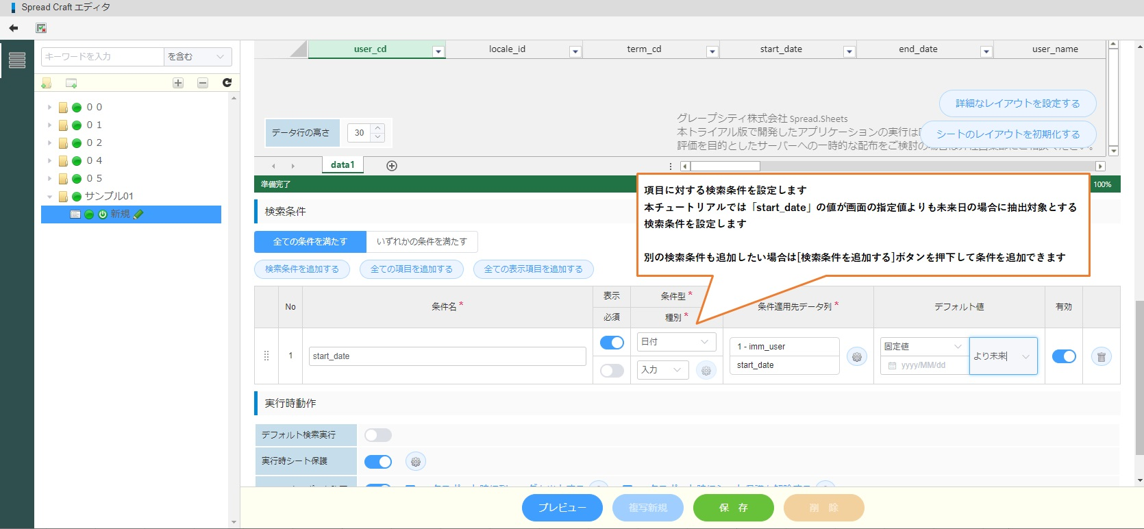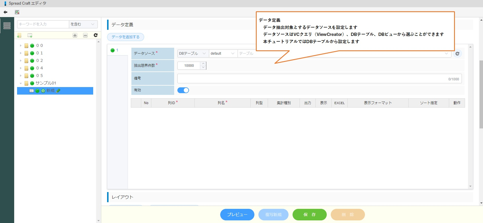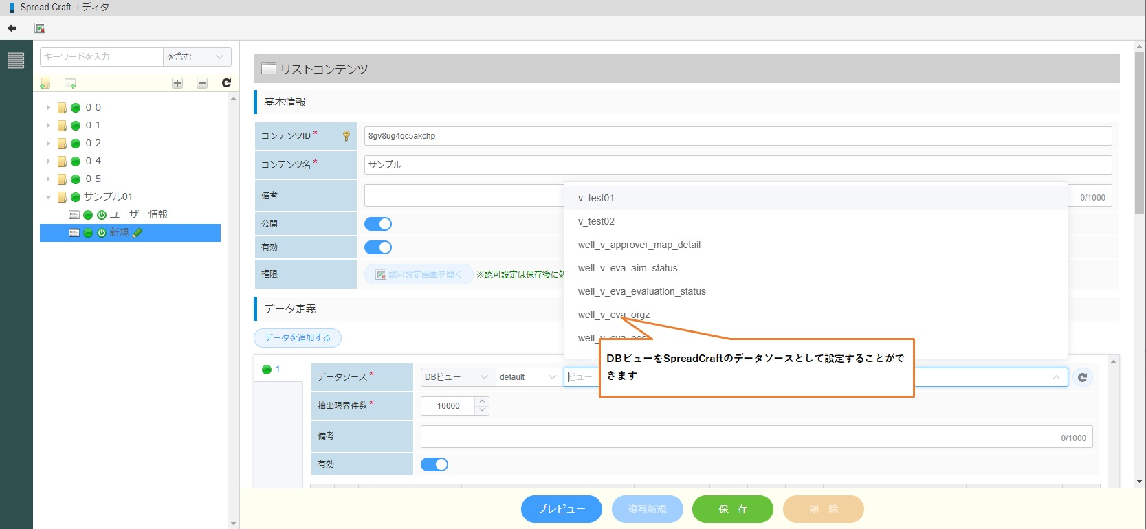 ①SpreadCraftEditorにてコンテンツ作成時にデータソースとしてDBビューを設定します。