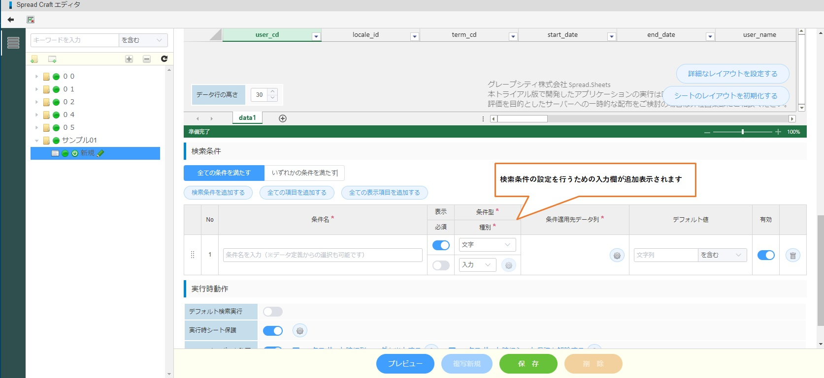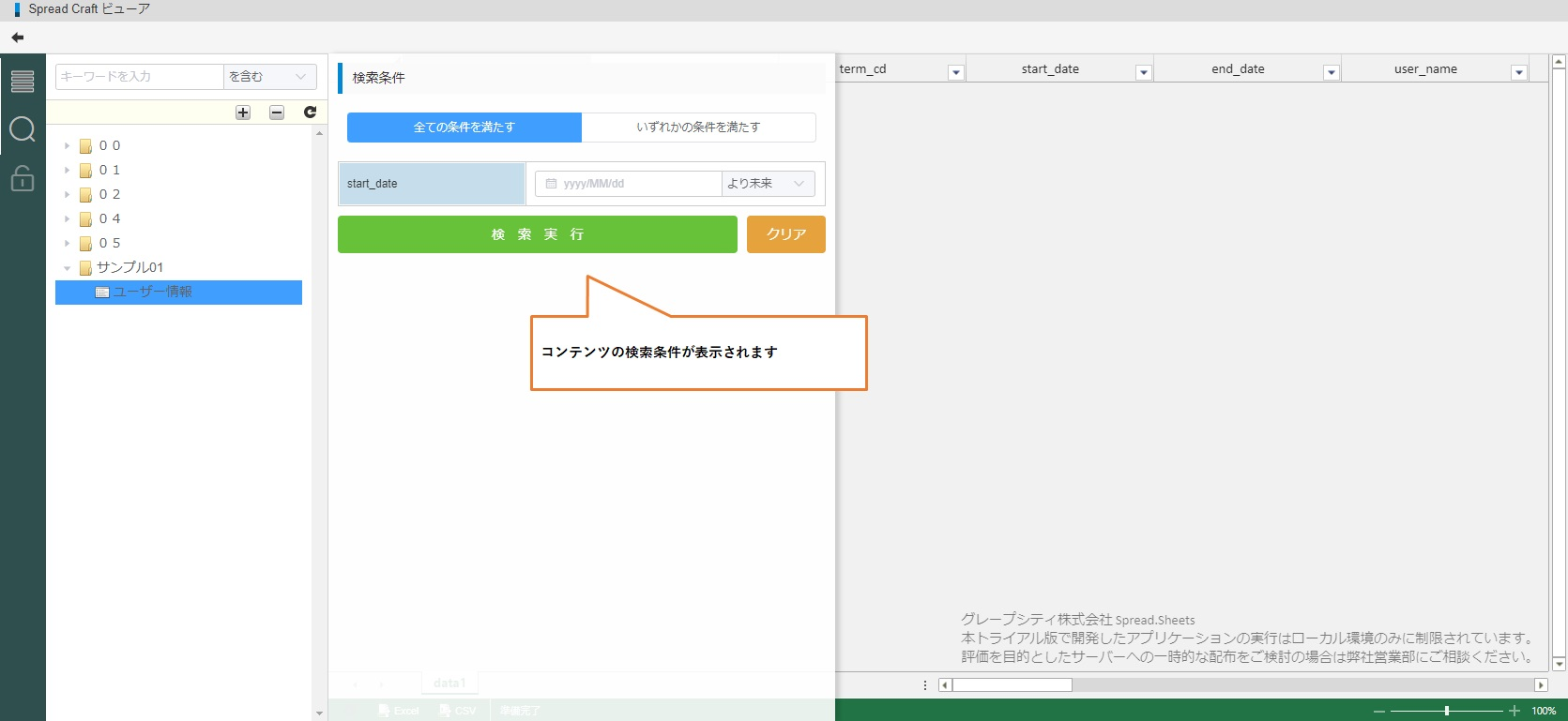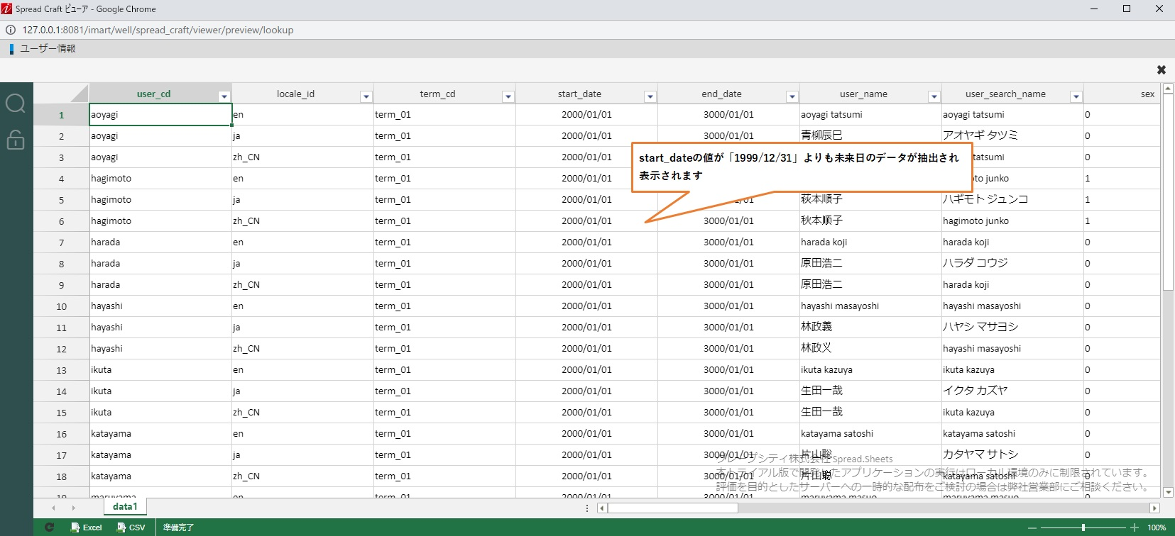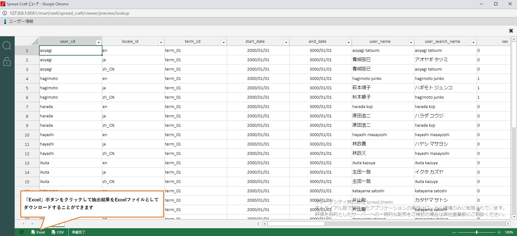 検索条件によって絞り込まれたデータソースの内容がExcelライクに表示されます。