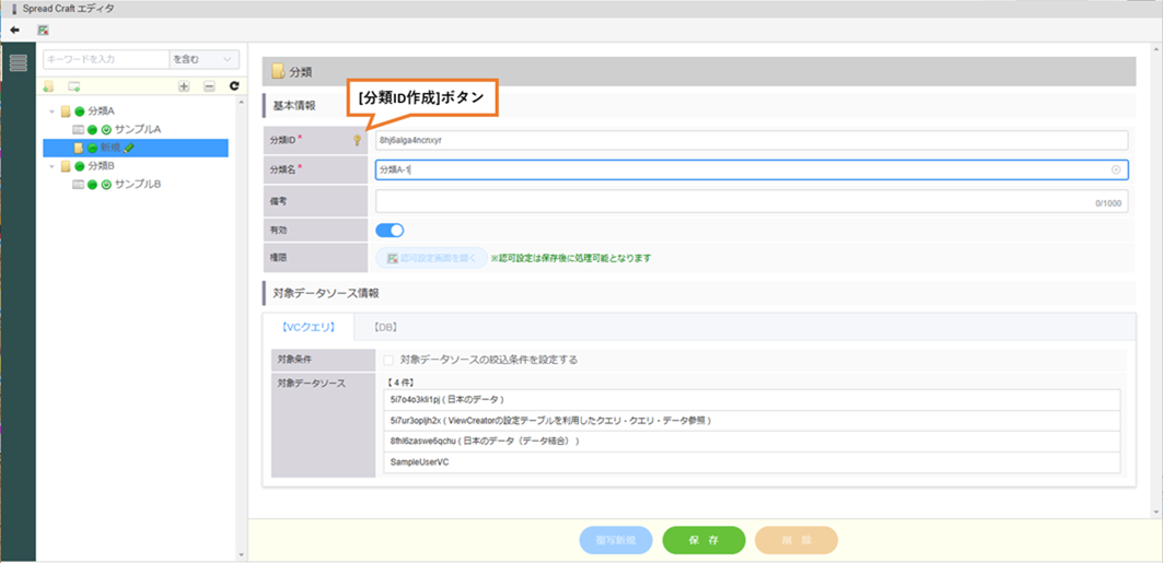 分類IDの[分類ID作成]ボタンを押下すると、機械的に分類IDを作成することができます。