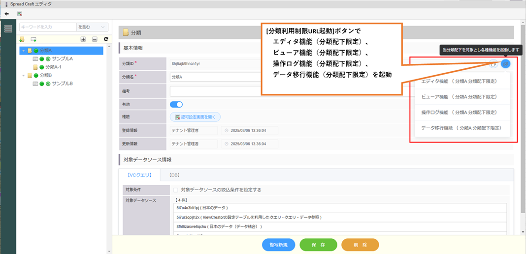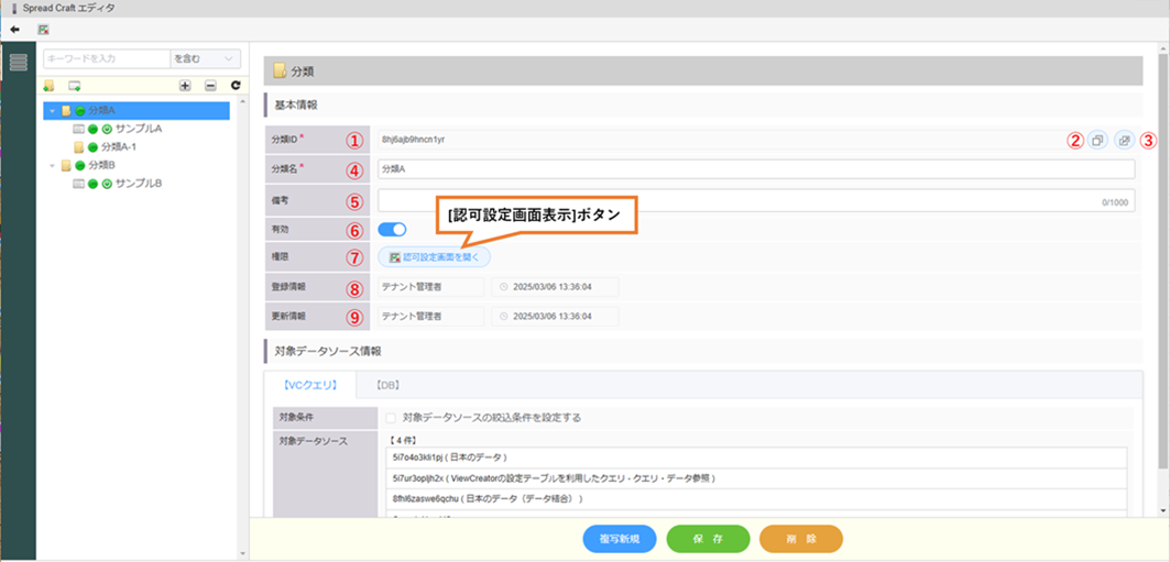 分類に属するコンテンツに対しデータソースの利用範囲を設定をします。
