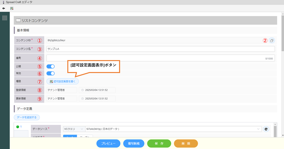 - プレビューボタンリストコンテンツの プレビュー を表示する