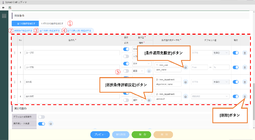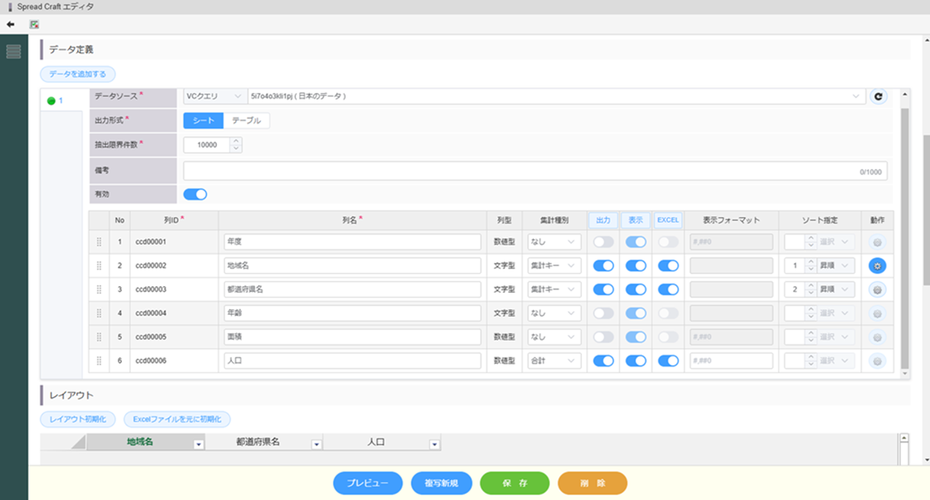 検索条件の設定、スプレッドに抽出するデータ定義およびスプレッドのレイアウト設定を行うことができます。
