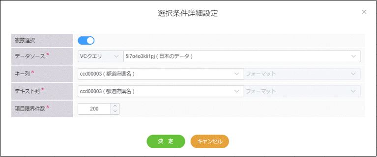 プルダウンに表示するデータリストの設定は、選択条件詳細設定ボタンを押下し、 選択条件詳細設定 画面で設定する