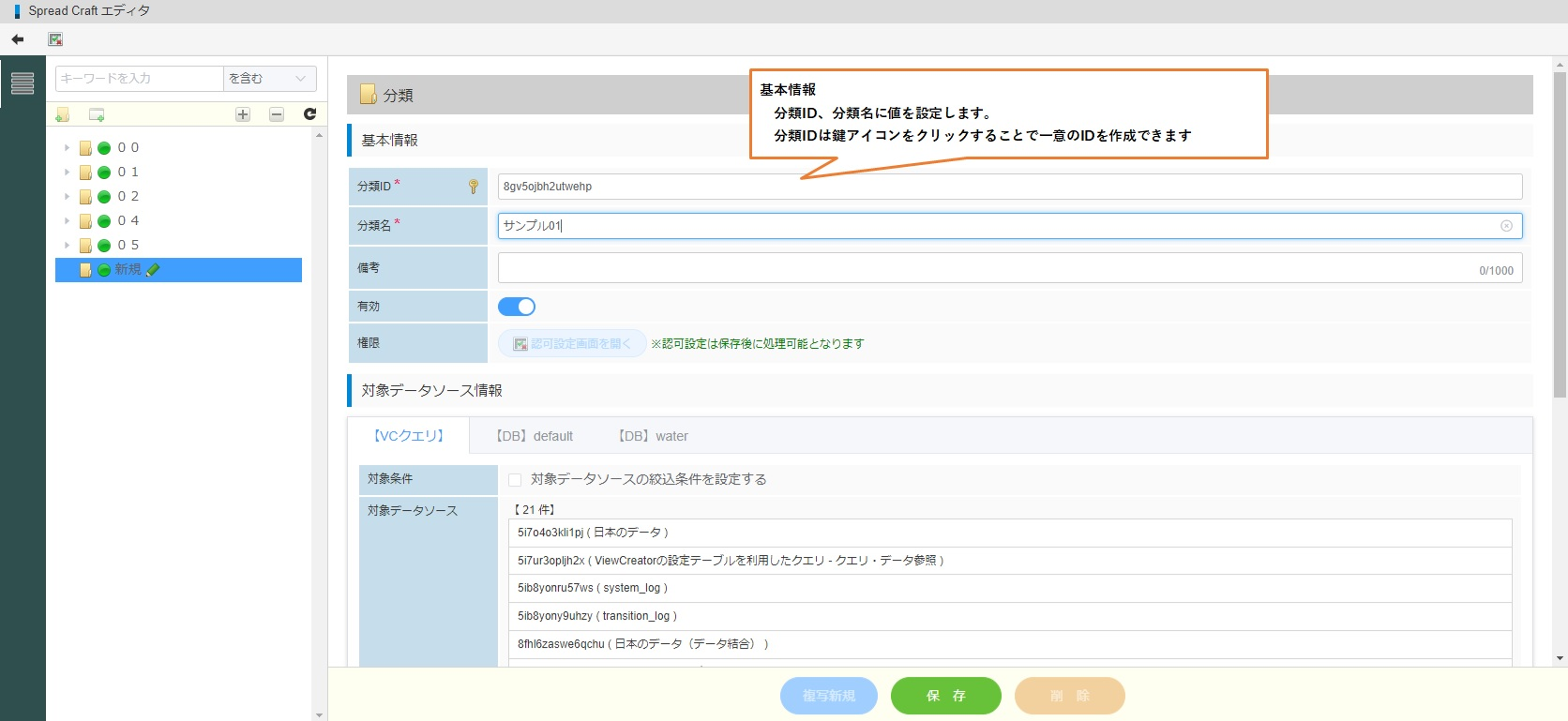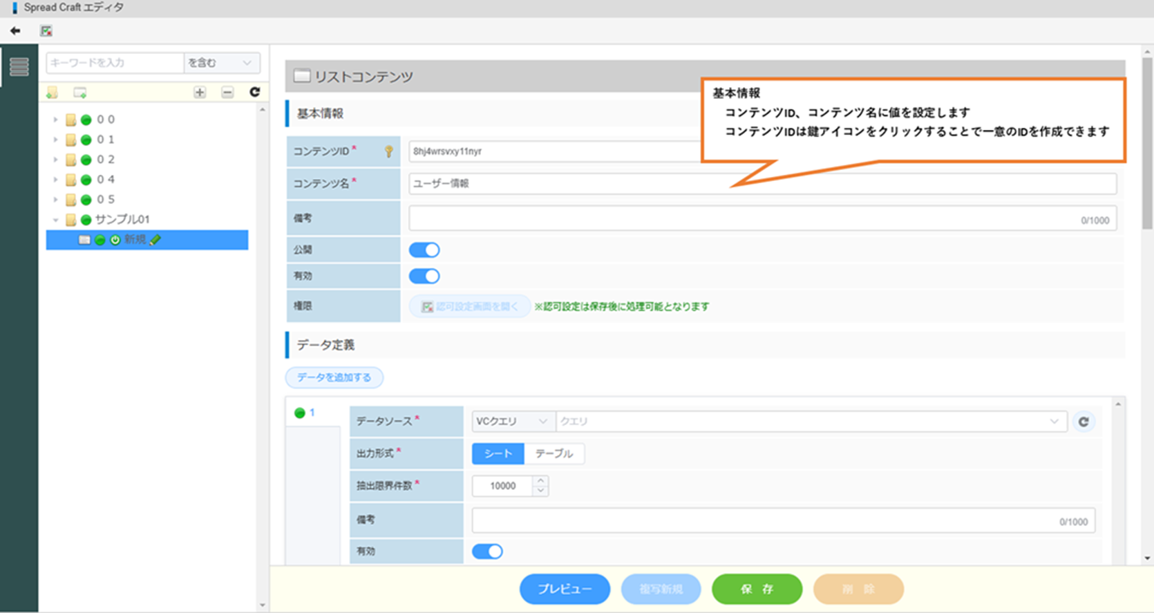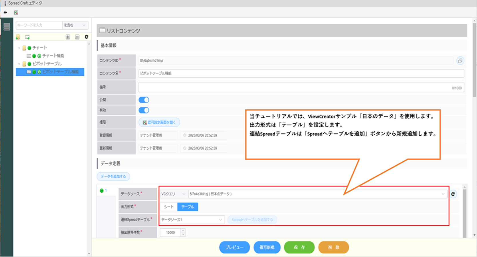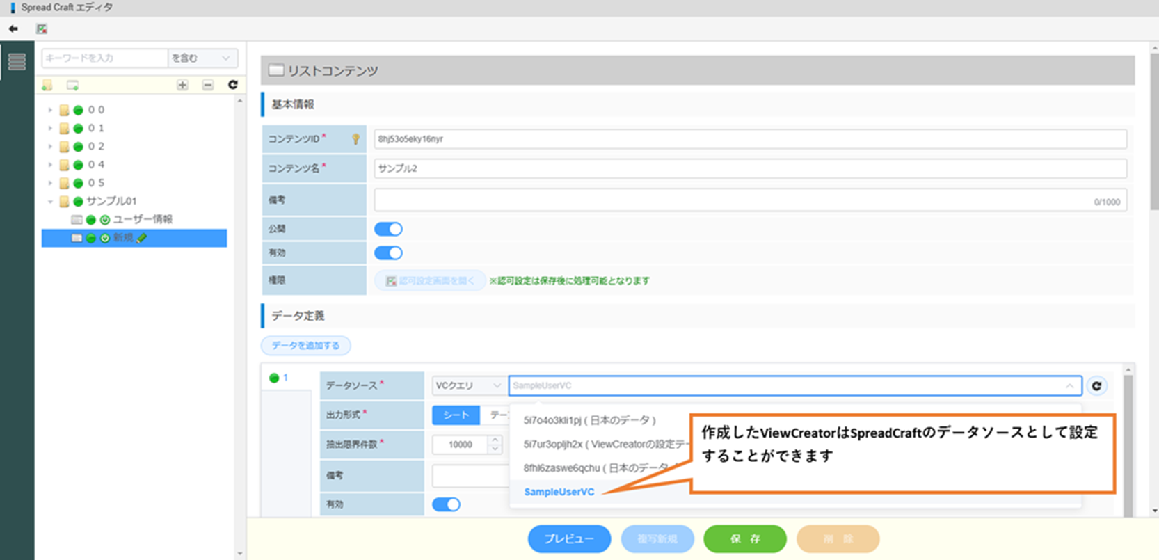 ④SpreadCraftEditorにてコンテンツ作成時にデータソースとして作成したViewCreatorを設定します。