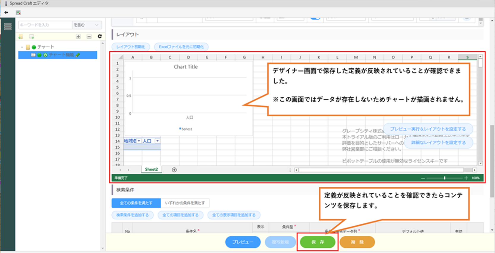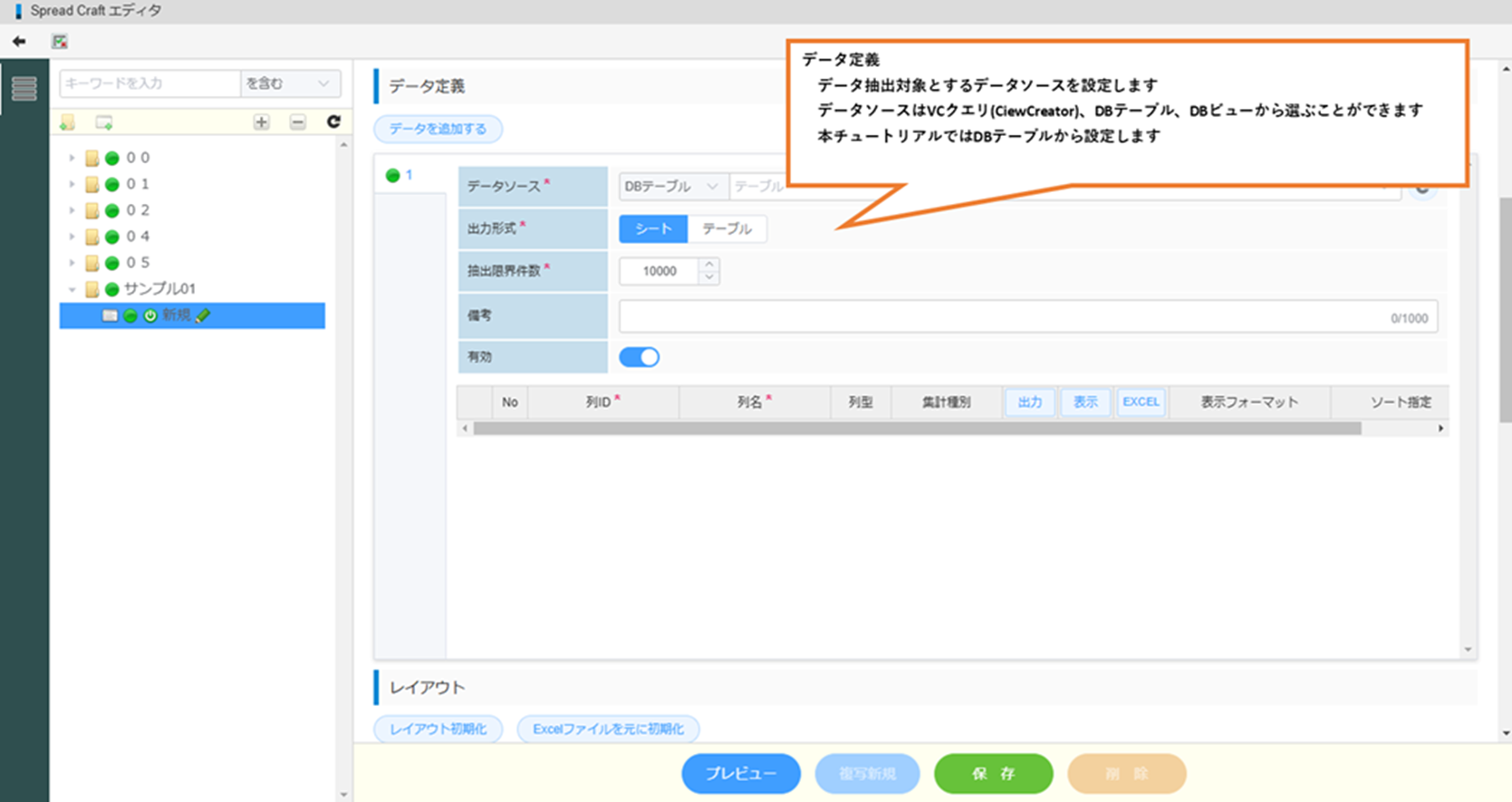 ①SpreadCraftEditorにてコンテンツ作成時にデータソースとしてDBビューを設定します。