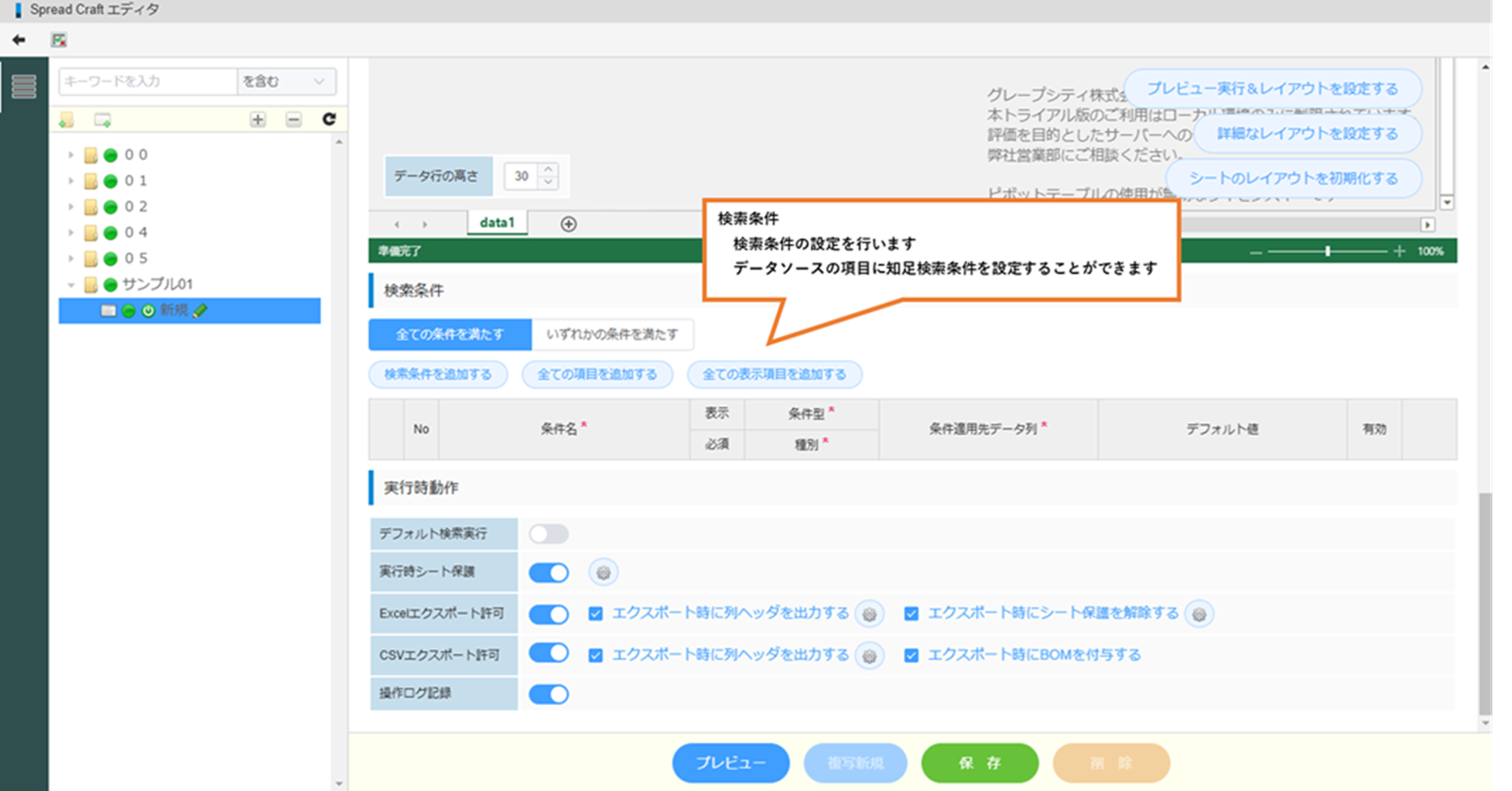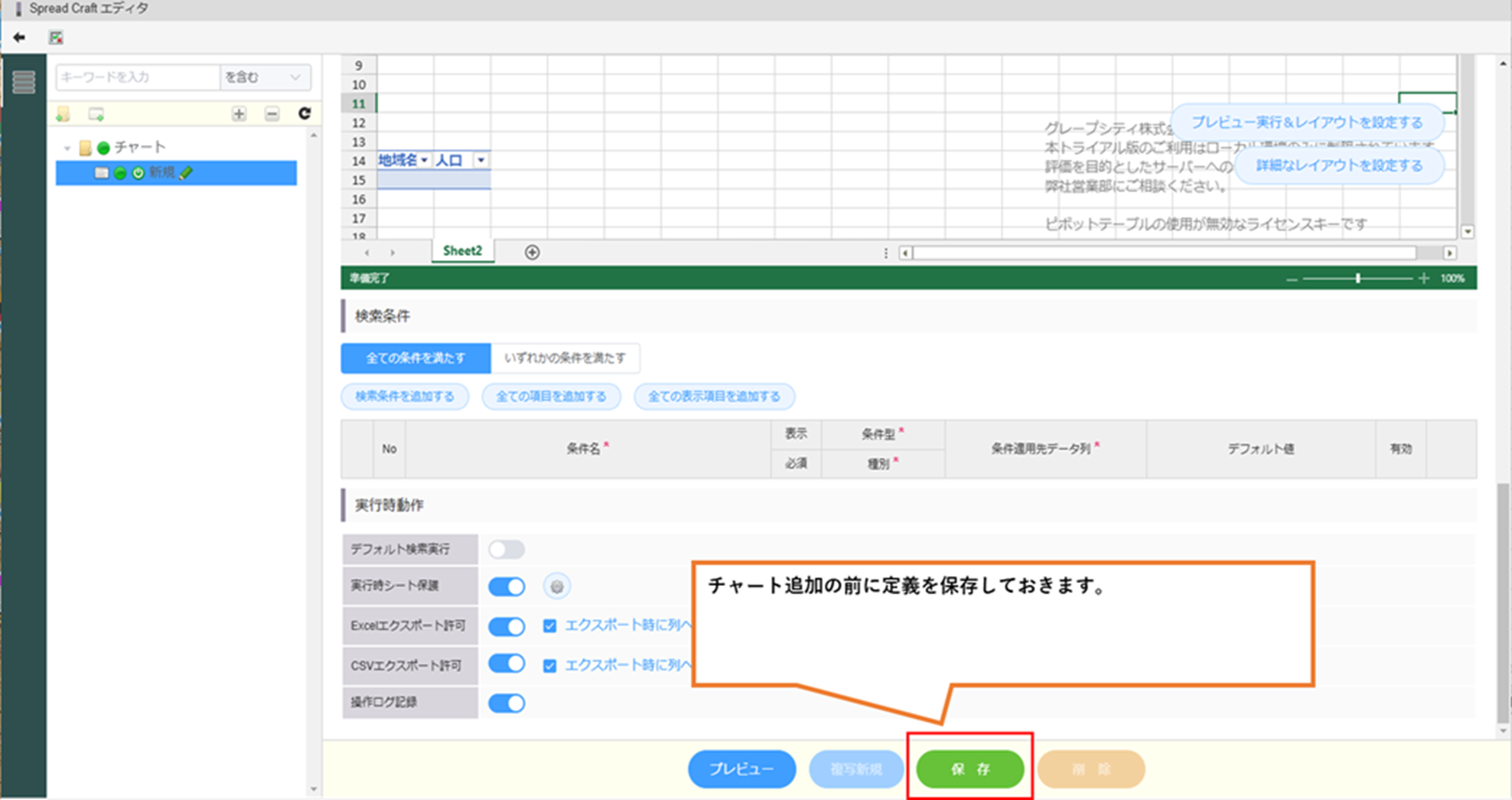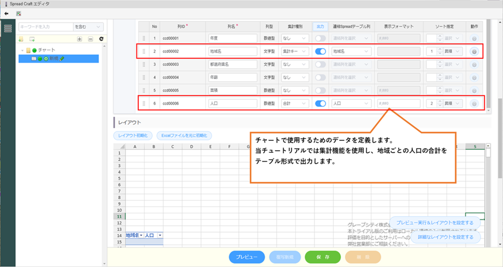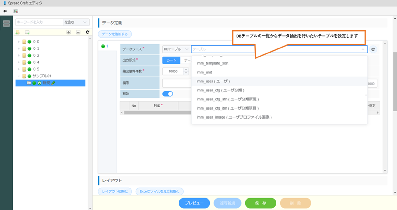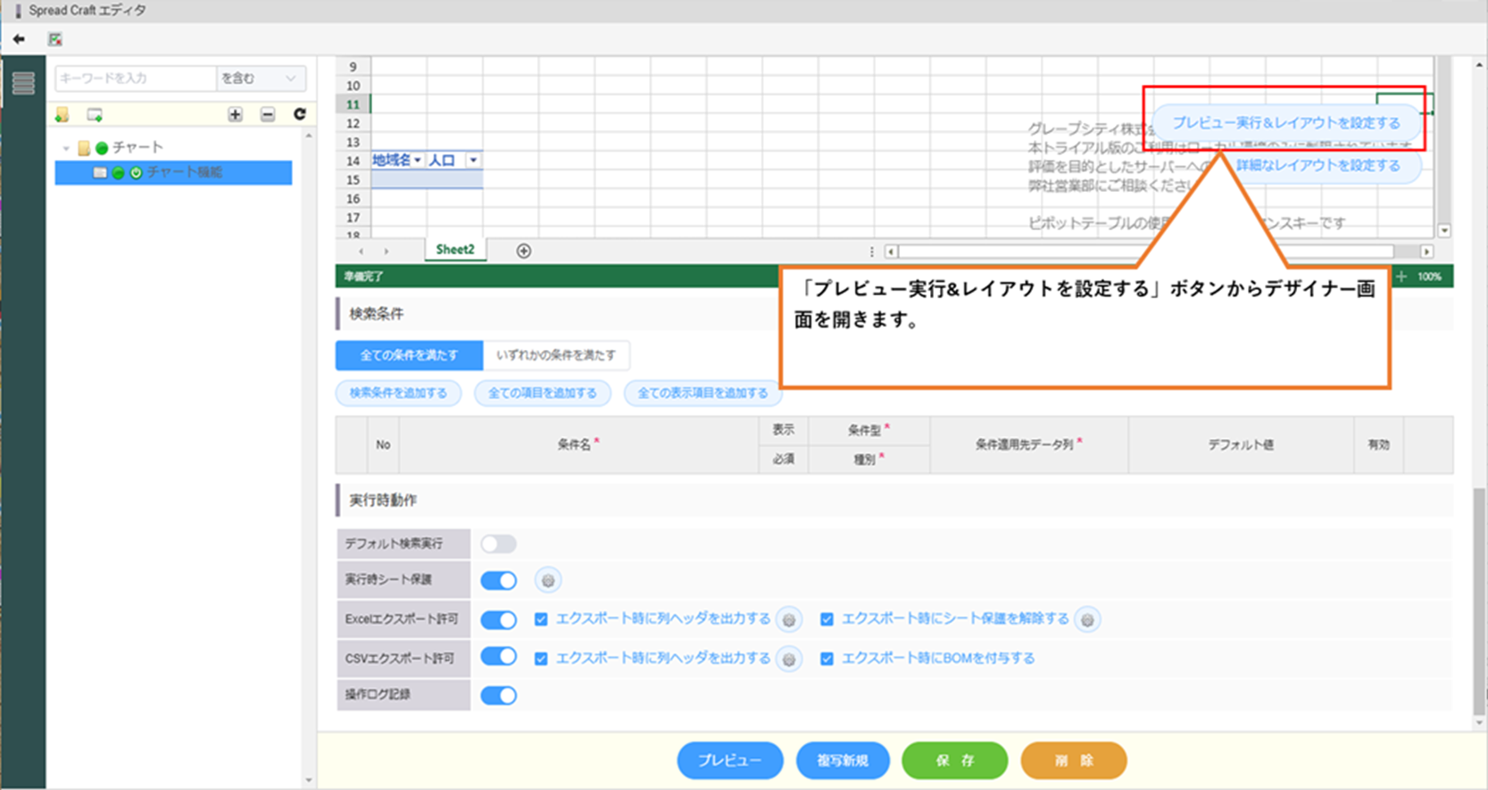 プレビュー実行&レイアウトを設定するボタンからデザイナーを表示