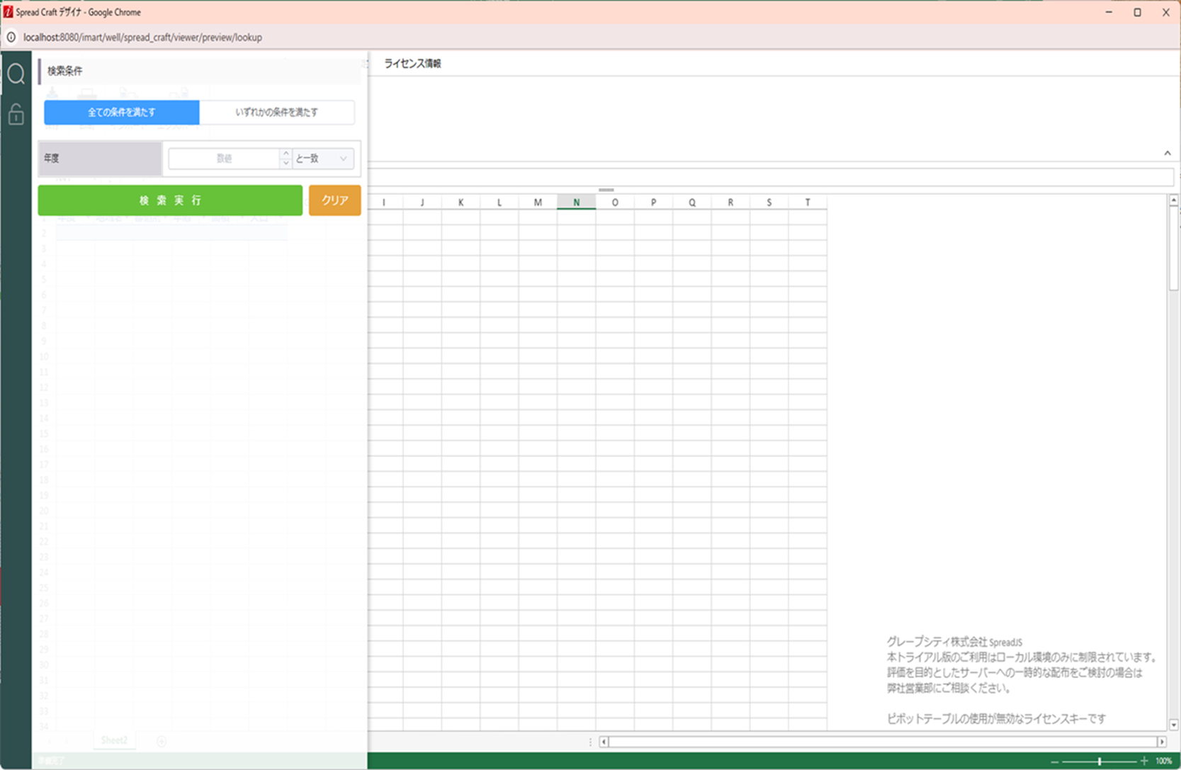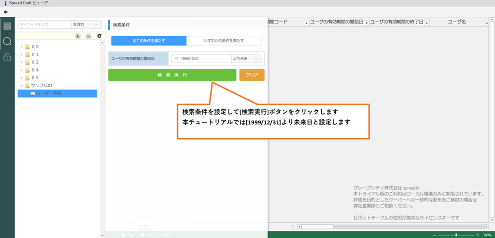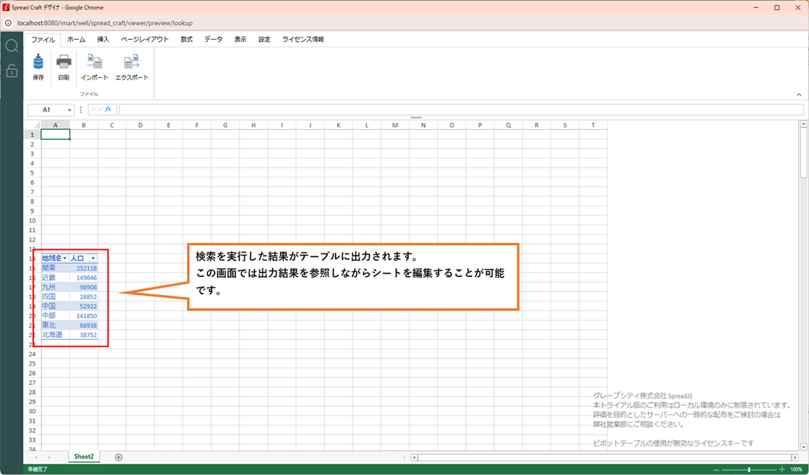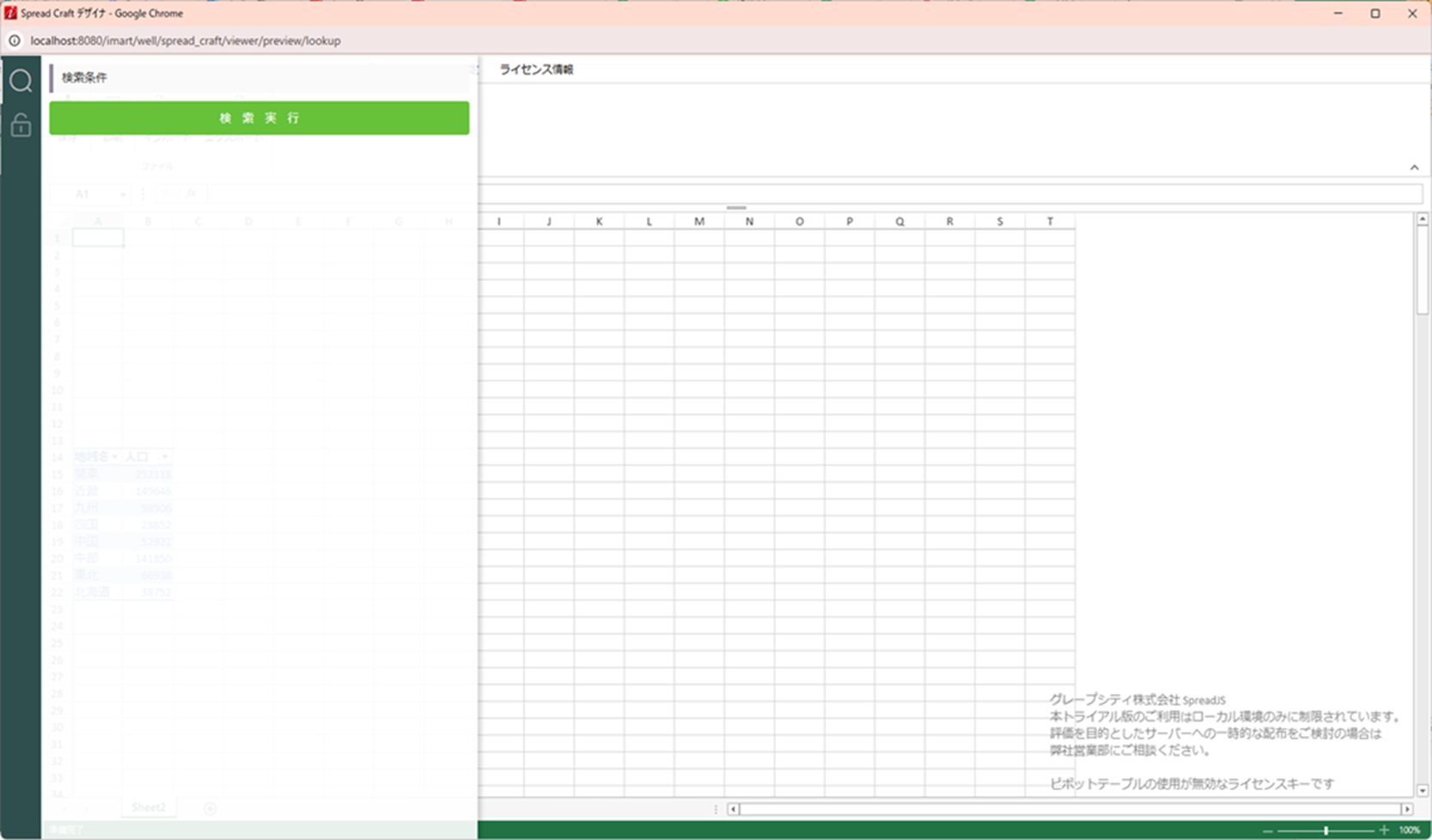検索条件によって絞り込まれたデータソースの内容がExcelライクに表示されます。
