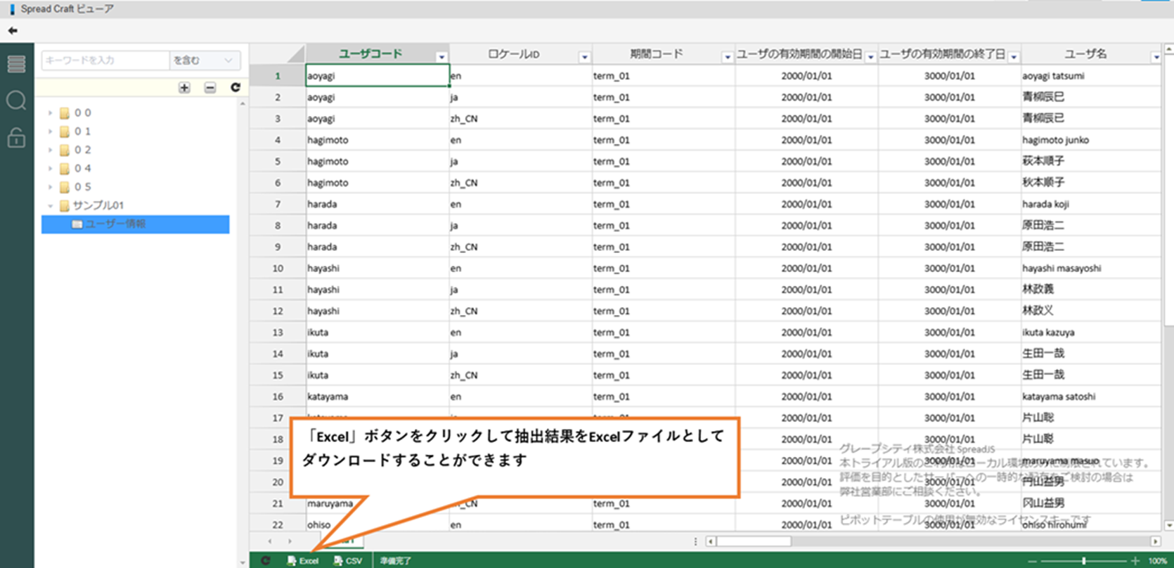 「CSV」ボタンをクリックすることで抽出結果をCSVファイルとしてもダウンロードできます。