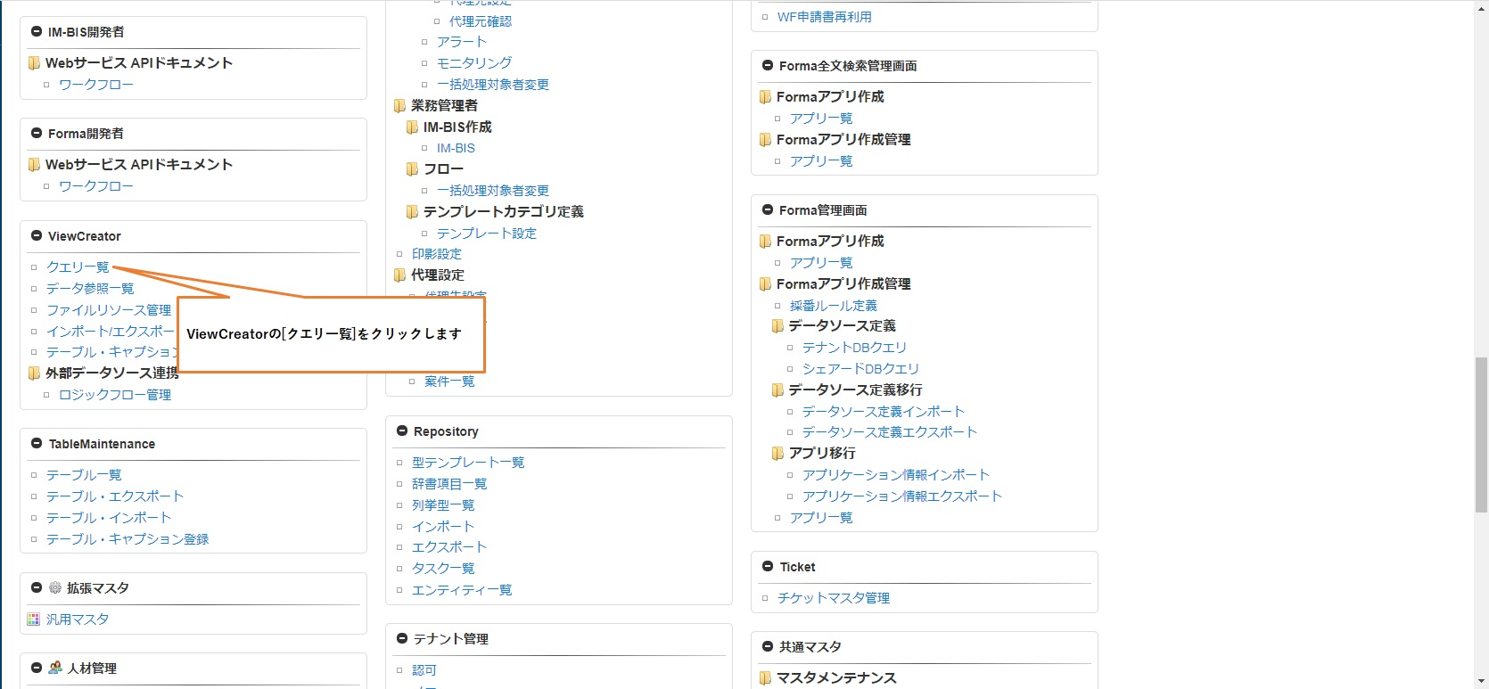 ①サイトマップよりViewCreatorの「クエリ一覧」リンクをクリックします。
