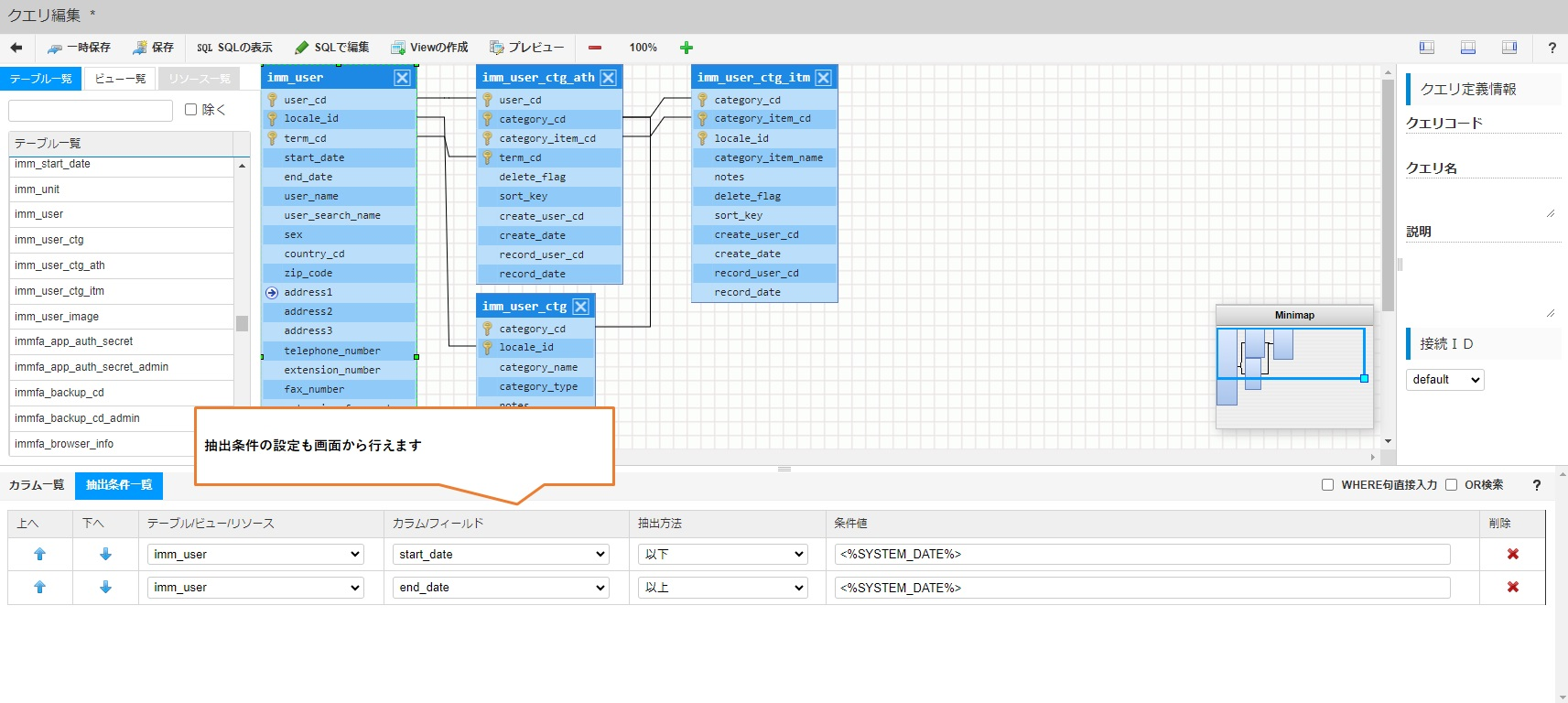 ③クエリ編集画面にてテーブルの結合の設定、出力項目の設定、抽出条件の設定を行います。