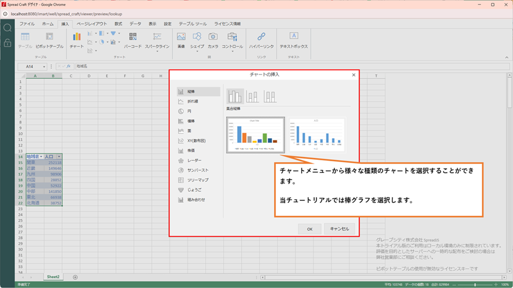 チャートメニューから棒グラフを選択し、チャートを追加します。