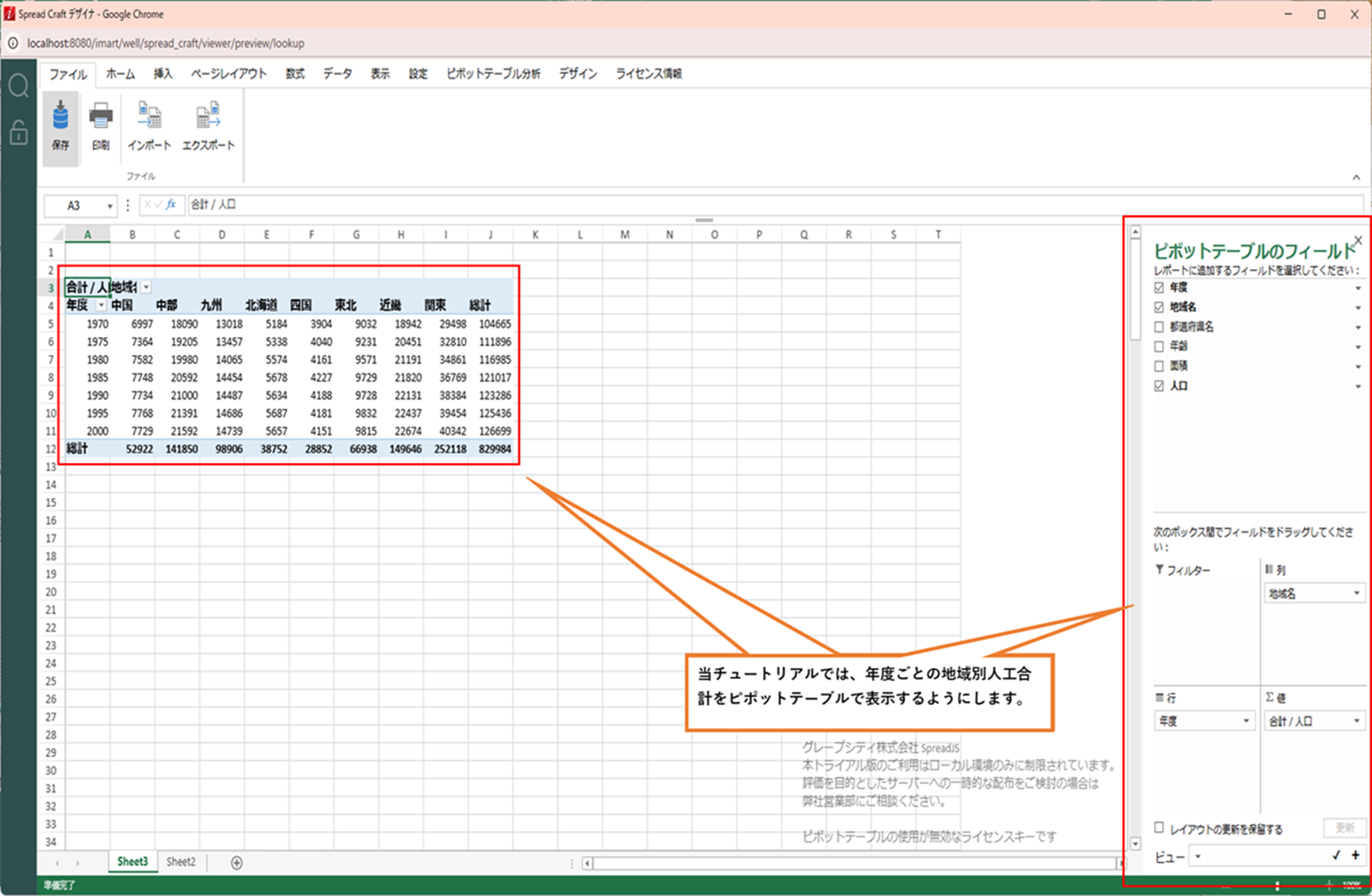 ②デザイナーを使用してテーブルからピボットテーブルを作成します。
