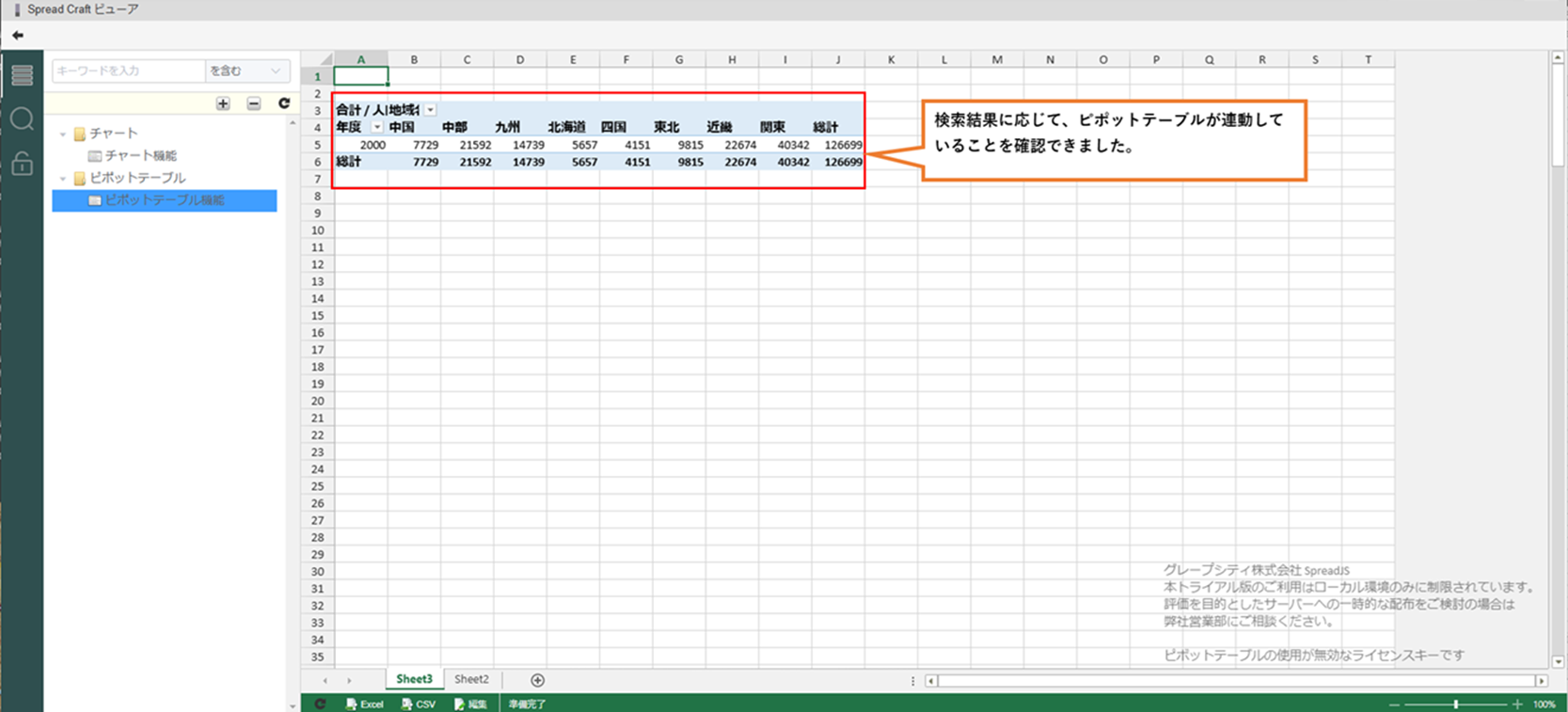検索結果に応じて、ピボットテーブルが連動していることを確認できました。