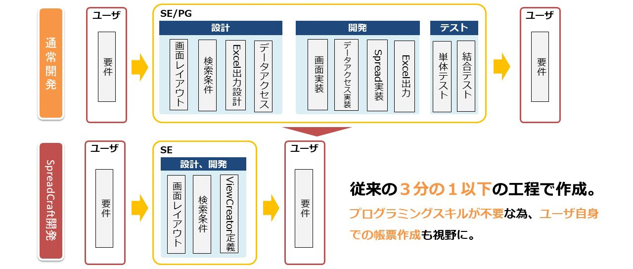 SpreadCraftを使用することにより、開発工程を大幅削減することができるため、コードレスで気軽にデータ活用の実現が可能となります。