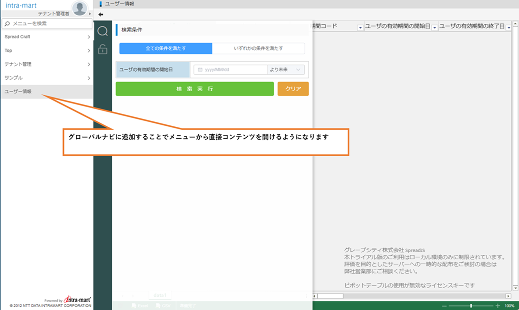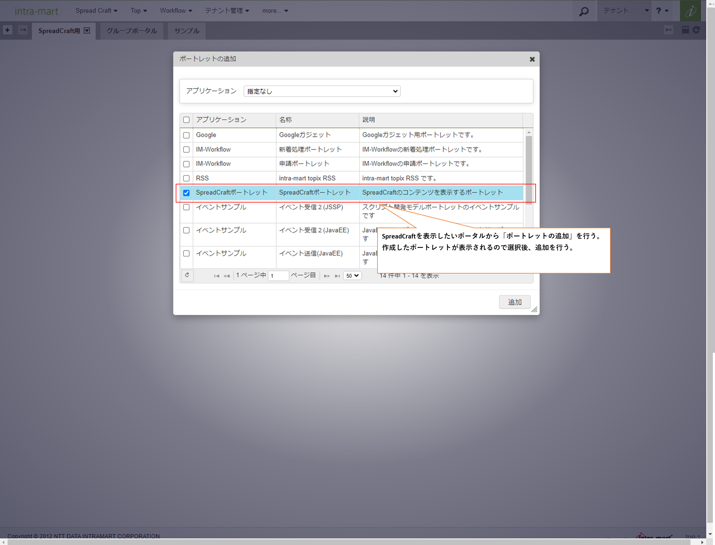登録したSpreadCraftのポートレットをポータル設定から追加する。