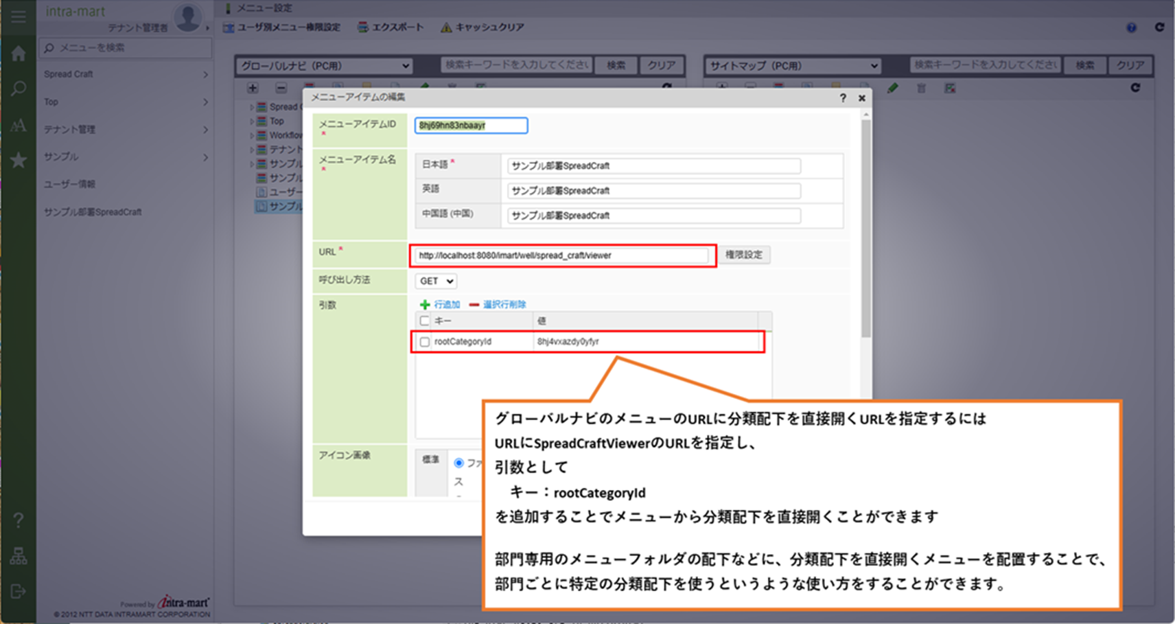 グローバルナビのメニューのURLに分類配下を直接開くURLを指定するには、URLにはSpreadCraftViewerのURLを指定し、引数としてキー:rootCategoryIdを追加する必要があります。