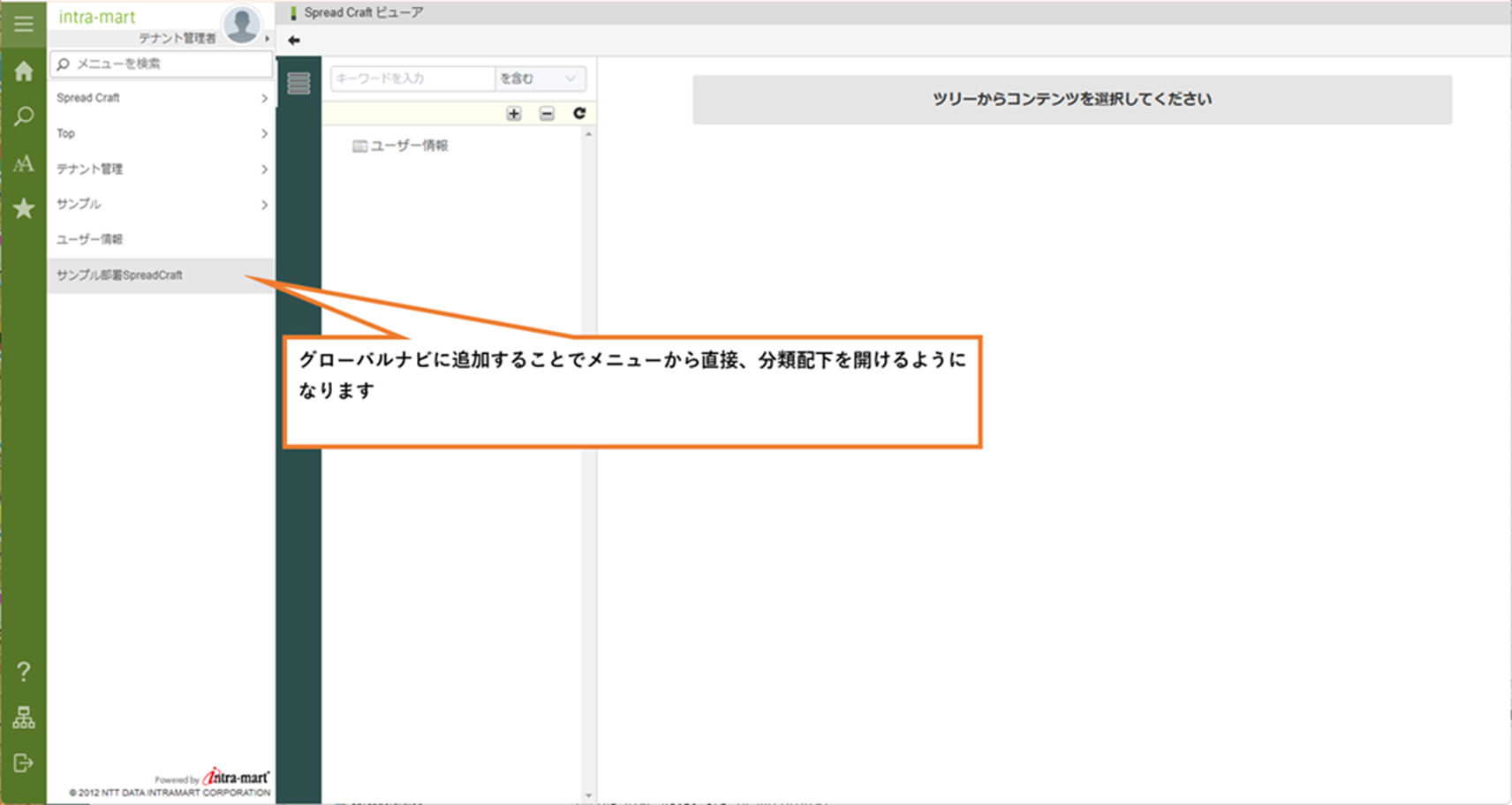 部門専用のメニューフォルダの配下などに、コンテンツを直接開くメニューを配置することで、部門ごとに特定のコンテンツを使うというような使い方をすることができます。