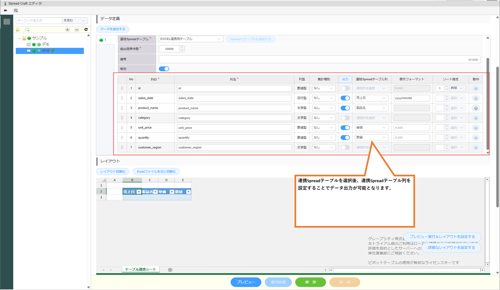 連携Spreadテーブル列とデータ列を連携する。
