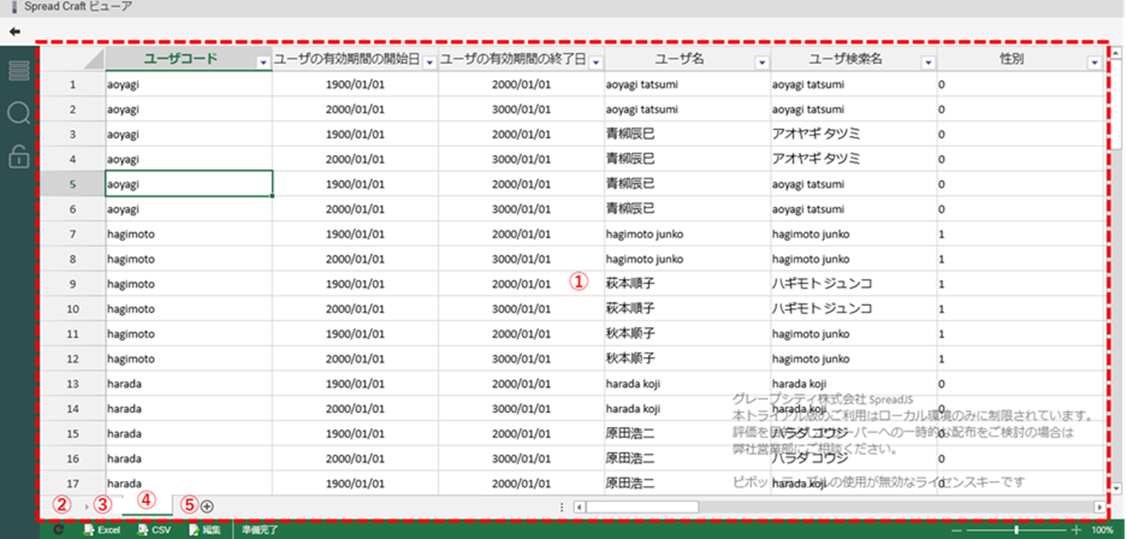 スプレッドコンテンツ詳細情報-実行時動作の設定により、デフォルト検索、データ編集、Excel形式またはCSV形式でのエクスポートが可能です。