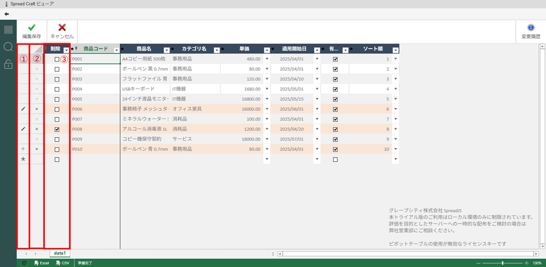 SpreadSheet上でデータの追加、編集、削除を行い、データベースに反映することができます。