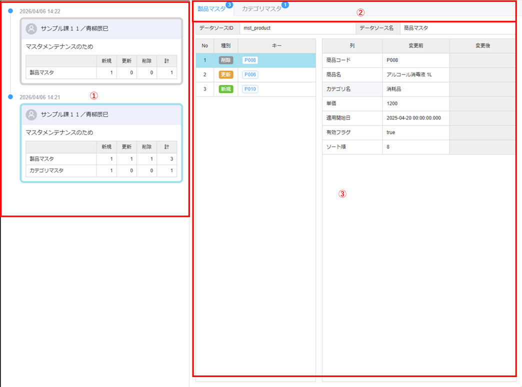 選択した対象データについて、列ごとの変更前、変更後の内容を表示します。